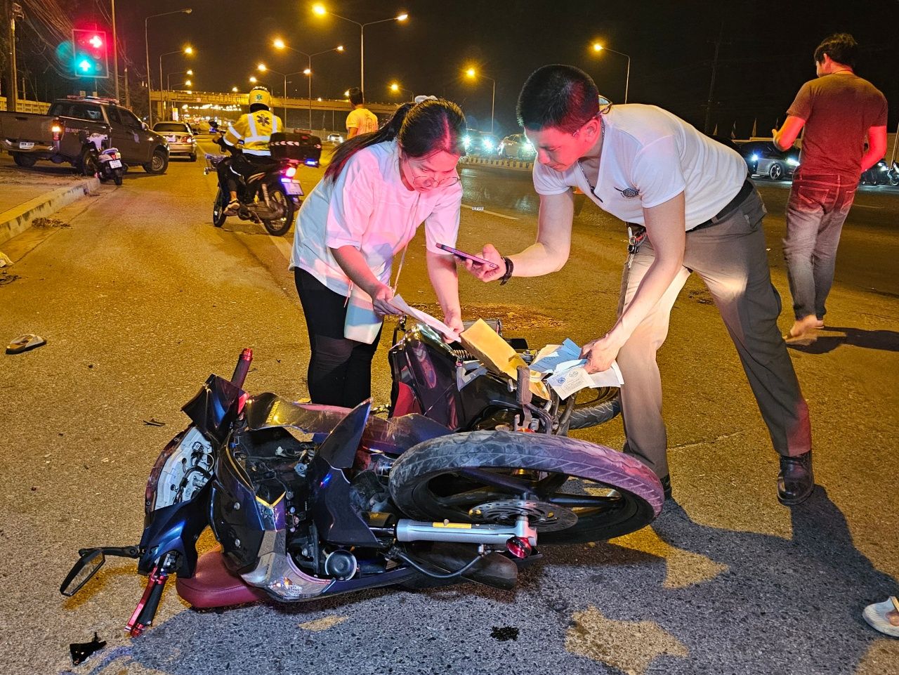 ที่เกิดเหตุบริเวณเลนซ้าย พบรถจักรยานยนต์ ฮอนด้า เวฟ สีดำ ทะเบียน ระยอง สภาพหน้ารถเสียหายหนัก พุ่งชนอัดอย่างแรงเข้ากลางลำตัวรถโตโยต้า ฟอร์จูนเนอร์ สีดำกรุงเทพมหานคร โดยมี นายสุชาติ คนคง เป็นคนขับ ส่งผลให้คนขี่และซ้อนท้ายรถจักรยานยนต์ เป็นเด็กผู้หญิง ทราบชื่อคือ น.ส.พศิกา อายุ 16 ปี และ น.ส.กอหญ้า อายุ 15 ปี นอนหมดสติอาการสาหัส กู้ภัยได้ทำการปฐมพยาบาลและปั๊มหัวใจยื้อชีวิต ก่อนเร่งนำตัวส่งรักษายังห้องฉุกเฉิน โรงพยาบาลสมเด็จพระนางเจ้าสิริกิติ์ กรมแพทย์ทหารเรือ ก่อนเสียชีวิตในเวลาต่อมา