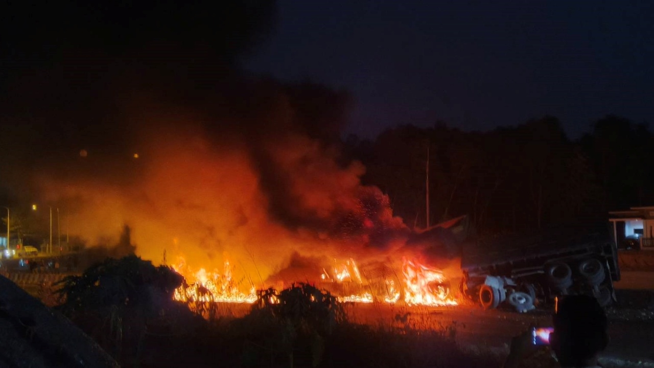 ถังน้ำมันรถพ่วงบรรทุกทราย เกิดไฟไหม้วอด หลังเกิดอุบัติเหตุชนกับกระบะ บน ถ.บายพาส จ.ระยอง คนขับพ่วงถูกไฟคลอกบาดเจ็บ ตร.เร่งเก็บภาพวงจรปิด จุดเกิดเหตุ