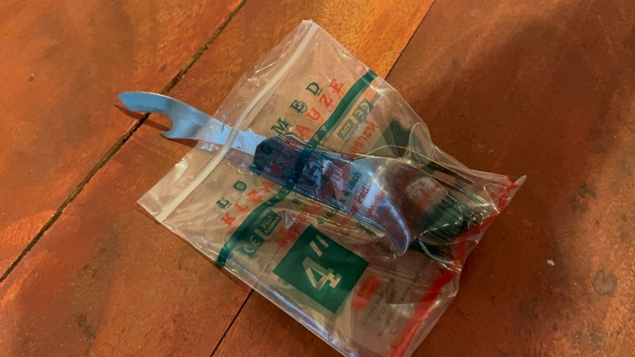 จากการตรวจสอบในที่เกิดเหตุ พบพวงกุญแจอเนกประสงค์ปลายเป็นมีดลักษณะหัวส้อม มีคราบเลือดติดตกอยู่ภายในบ้าน เจ้าหน้าที่จึงเก็บไว้เป็นหลักฐาน