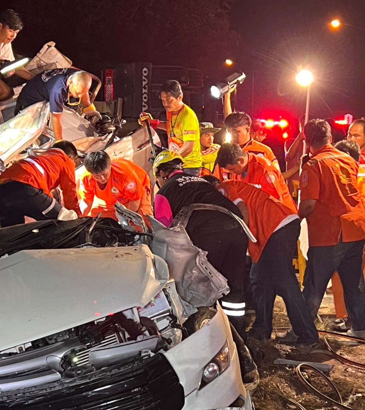 ที่เกิดเหตุพบรถบรรทุกพ่วง 18 ล้อบรรทุกยี่ห้อวอลโว่สีขาวทะเบียนระยอง พลิกคว่ำตะแคงอัดก๊อปปี้รถยนต์ ยี่ห้อโตโยต้า อินโนวา 5 ประตูสีขาว ทะเบียนกรุงเทพมหานคร พังยับเยินทั้งคัน มีผู้ได้รับบาดเจ็บร้องครวญคราง เจ้าหน้าที่ต้องใช้รถเครนยกรถพ่วงออกจากซากรถยนต์ และใช้อุปกรณ์ตัดถ่างช่วยเหลือผู้บาดเจ็บ ทราบชื่อ นายหว่องว่ง อายุ 38 ปี คนขับรถ เจ้าหน้าที่จึงได้รีบนำส่ง รพ.แกลง ภายในรถยังมีผู้เสียชีวิต 3 ราย ทราบชื่อคือ นายเฉิน อายุ 49 ปี นายหลัว หงเฉิง อายุ 39 ปี และนายหลี่หยวน อายุ 40 ปี ทั้งหมดเป็นนักท่องเที่ยวชาวจีน