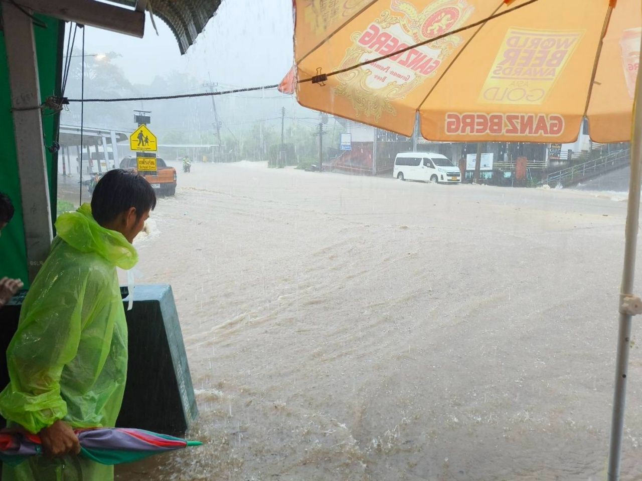 เมื่อเวลา 09.00 น. วันที่ 11 มิถุนายน 2568 ผู้สื่อข่าวรายงานว่า หลังเกิดฝนตกหนักอย่างต่อเนื่องในพื้นที่ ต.คลองใหญ่ อ.คลองใหญ่ จ.ตราด ทำให้มีปริมาณน้ำสะสม ประกอบกับน้ำป่าไหลจากเขาบรรทัดลงมาสมทบ ทำให้น้ำระบายไม่ทัน เกิดน้ำท่วมผิวถนนตั้งแต่ไฟแดงคลองใหญ่ หน้าโรงเรียนนคราศึกษา แต่รถยังสัญจรได้