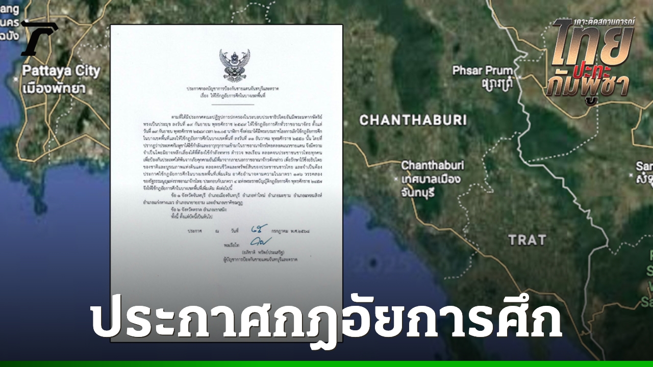 มีผลตั้งแต่วันนี้ กองบัญชาการป้องกันชายแดนจันทบุรีและตราด ประกาศกฎอัยการศึกในบางเขตพื้นที่ใน จ.จันทบุรี และ จ.ตราด เหตุจากสถานการณ์ชายแดนไทยกัมพูชา