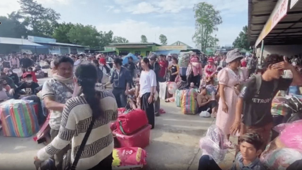 ชาวกัมพูชาหลายพันคนขนข้าวของมารอหน้าด่านบ้านแหลม จ.จันทบุรี รอเจ้าหน้าที่ไทยเปิดด่านเพื่อเดินทางกลับประเทศ หลังเกิดเหตุปะทะริมชายแดนไทย-กัมพูชา