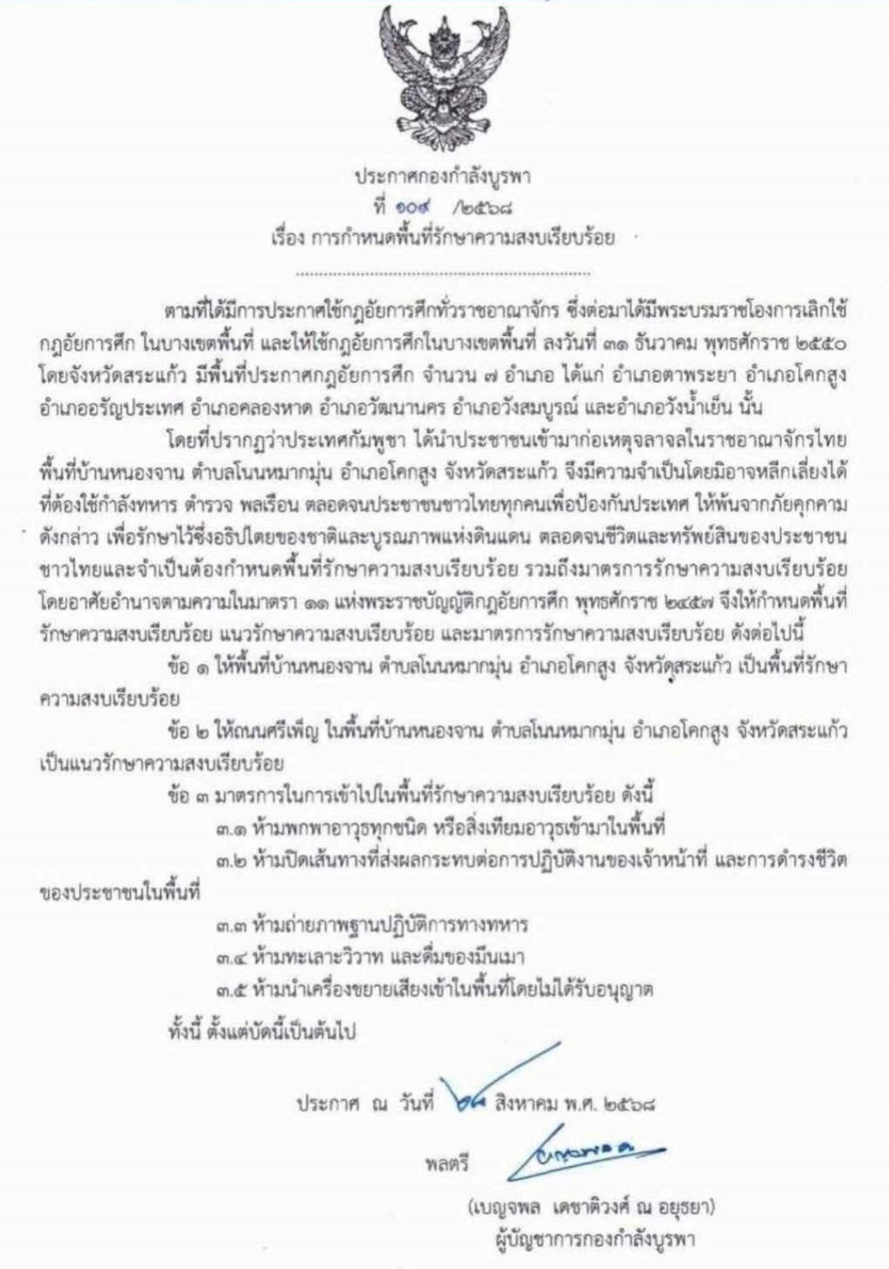 วันที่ 29 สิงหาคม 2568 มีรายงานว่า พลตรีเบญจพล เดชาติวงศ์ ณ อยุธยา ผู้บัญชาการกองกำลังบูรพา ได้ลงนามคำสั่งประกาศกองกำลังบูรพา เรื่อง การกำหนดพื้นที่รักษาความสงบเรียบร้อย ระบุว่า ตามที่ได้มีการประกาศใช้กฎอัยการศึกทั่วราชอาณาจักร ซึ่งต่อมาได้มีพระบรมราชโองการเลิกใช้กฎอัยการศึกในบางเขตพื้นที่ และให้ใช้กฎอัยการศึกในบางเขตพื้นที่ ลงวันที่ 31 ธันวาคม พุทธศักราช 2550 โดยจังหวัดสระแก้ว มีพื้นที่ประกาศกฎอัยการศึก จำนวน 7 อำเภอ ได้แก่ อำเภอตาพระยา อำเภอโคกสูง อำเภออรัญประเทศ อำเภอคลองหาด อำเภอวัฒนานคร อำเภอวังสมบูรณ์ และอำเภอวังน้ำเย็น นั้น