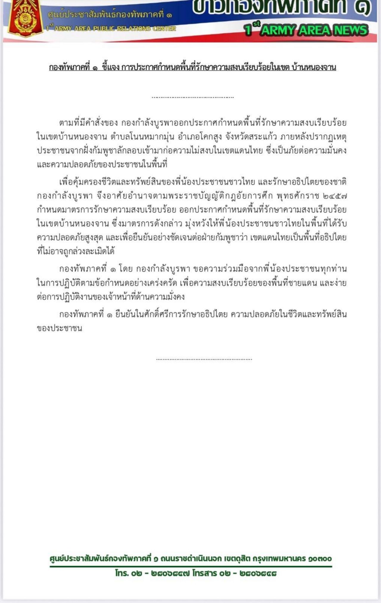 กองทัพภาคที่ 1 ชี้แจงประกาศกำหนดพื้นที่รักษาความสงบเรียบร้อย "บ้านหนองจาน" จ.สระแก้ว เพื่อให้คนไทยในพื้นที่ได้รับความปลอดภัยสูงสุด และยืนยันต่อฝ่ายกัมพูชาว่า เขตแดนไทยเป็นพื้นที่อธิปไตยที่ไม่อาจถูกล่วงละเมิดได้