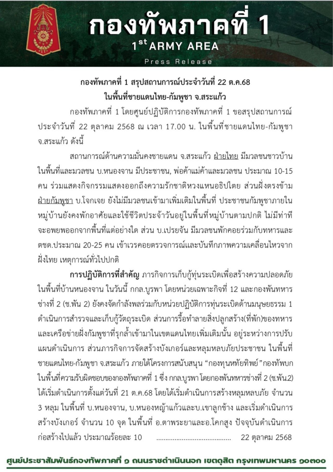 วันที่ 22 ต.ค. 68 กองทัพภาคที่ 1 โดยศูนย์ปฏิบัติการกองทัพภาคที่ 1 สรุปสถานการณ์ประจำวันที่ 22 ตุลาคม 2568 ณ เวลา 17.00 น. ในพื้นที่ชายแดนไทย-กัมพูชา จ.สระแก้ว ดังนี้