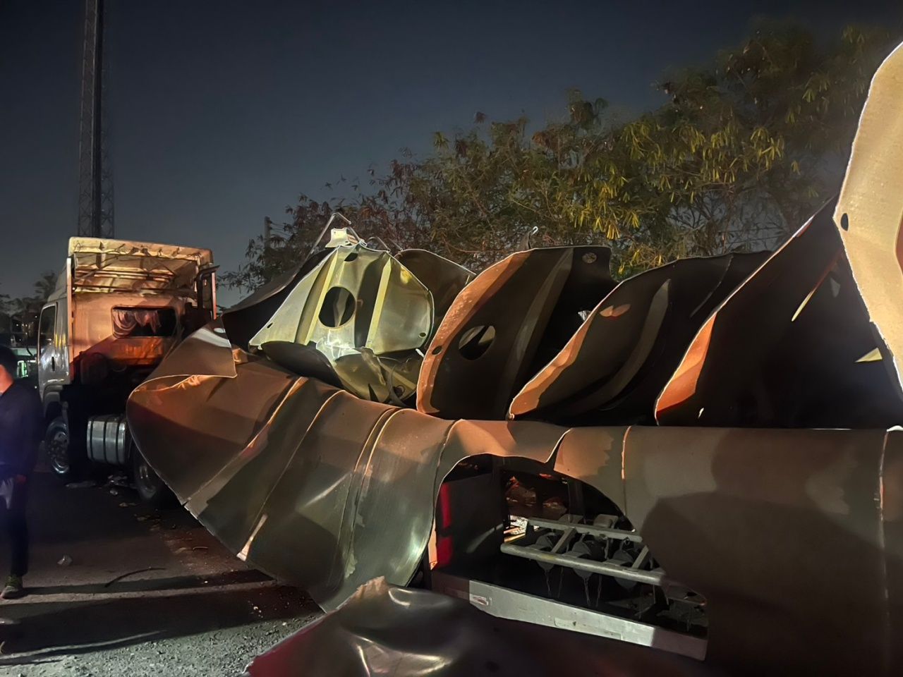 ที่เกิดเหตุเป็นลานจอดรถบรรทุก ที่บริเวณท้ายลานพบเศษซากรถบรรทุกน้ำมัน 18 ล้อ ยี่ห้อ อีซูซุ สีขาว ทะเบียนชลบุรี หมายเลขทะเบียนบางส่วนหายไปจากแรงระเบิด จนทำให้บริเวณตัวถังน้ำมันขนาด 50,000 ลิตร ฉีกขาดจนเป็นซาก โชคดีที่ภายในไม่มีน้ำมันบรรจุอยู่ ถัดมาที่บริเวณป่าหญ้า พบศพผู้เสียชีวิต ทราบชื่อคือนายณรงค์ อายุ 36 ปี ชาว จ.ชัยนาท เป็นคนงานในลานรถบรรทุก อยู่ในสภาพศพร่างกายฉีกขาด ชิ้นส่วนถูกแรงระเบิดอัดจนกระเด็นไปคนละทิศทาง ทั้งนี้เจ้าหน้าที่ได้กันพื้นที่ไว้ เพื่อป้องกันการเกิดเหตุซ้ำ