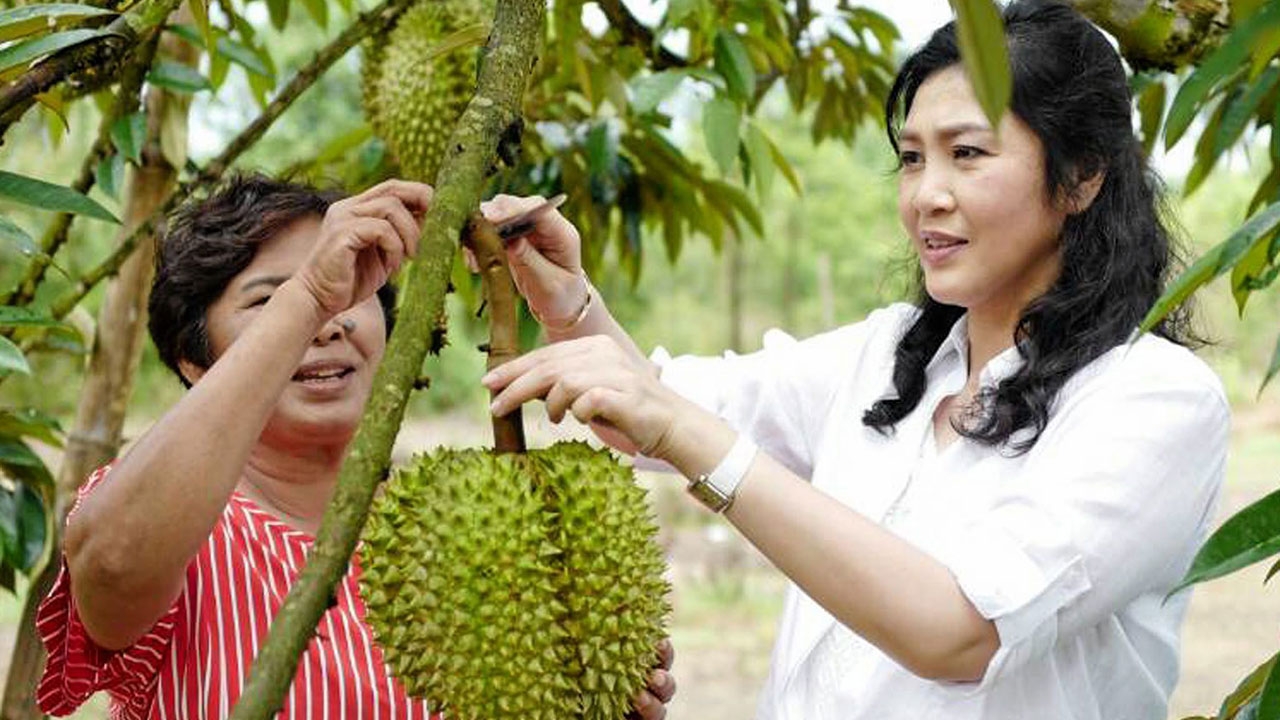 น.ส.ยิ่งลักษณ์ ชินวัตร อดีตนายกรัฐมนตรี ตัดผลทุเรียนจากต้นที่เจ้าของสวนสี่พี่น้องพาเดินชมแปลงผลไม้ที่ปลูกเอาไว้ หลังนำคณะร่วมทำบุญกับประชาชน ที่วัดท้าวอู่ทอง จ.ปราจีนบุรี.