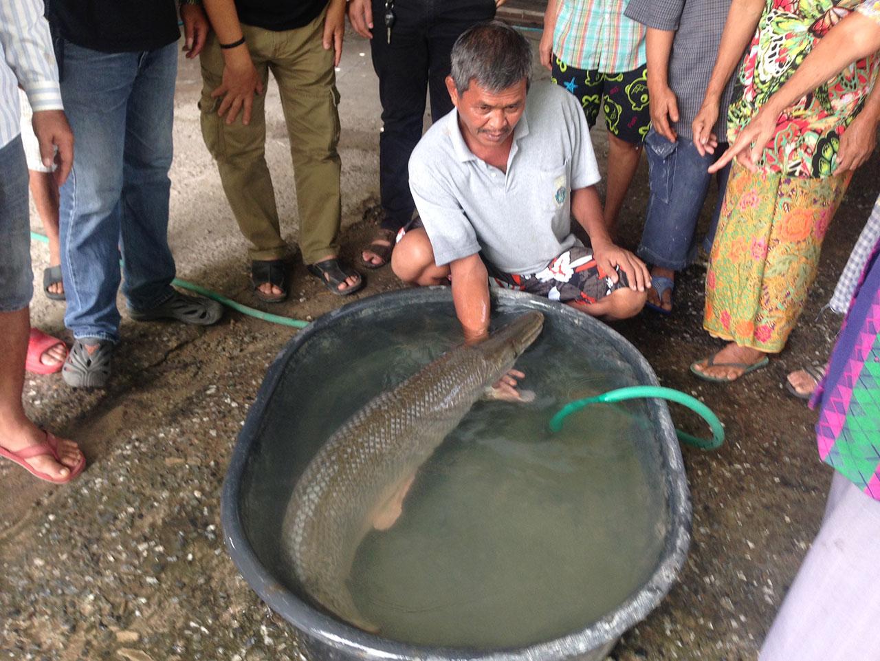 ที่บ้านเลขที่ 898 หมู่ที่ 10 ตำบลหนองอิรุณ อำเภอบ้านบึง จังหวัดชลบุรี ซึ่งเป็นบ้านของ นายสินชัย รัตนะ อายุ 58 ปี ผู้ที่จับปลาตัวดังกล่าวได้ โดยมีชาวบ้านมามุงดูจำนวนมาก จากการตรวจสอบ พบปลาดังกล่าว ลำตัวยาว 143 เซนติเมตร หนักประมาณ 25-30 กิโลกรัม