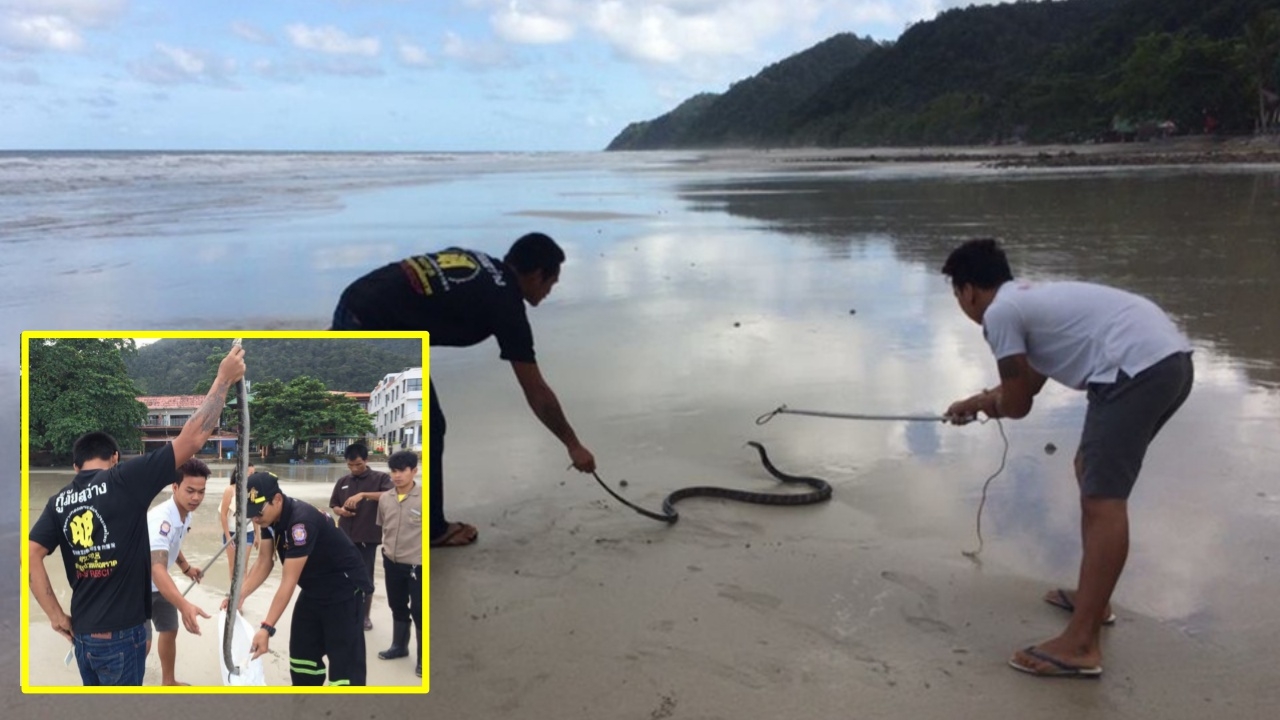 เมื่อเวลา 09.20 น. วันที่ 26 มิ.ย.60 อาสากู้ภัยสว่างบุญช่วยเหลือธรรมสถานตราด เขตเกาะช้าง จ.ตราด ได้รับแจ้งจากพนักงานของรีสอร์ตแห่งหนึ่ง ตั้งอยู่ริมหาดทรายขาว หมู่ 4 ต.เกาะช้าง ขอให้อาสากู้ภัยไปช่วยจับงูขนาดใหญ่ คาดว่าเป็นงูจงอางเลื้อยอยู่บนหาดทราย กลัวว่าจะเลื้อยเข้าไปภายในรีสอร์ตซึ่งมีลูกค้านักท่องเที่ยวพักอยู่จำนวนมาก และร้านอาหารในบริเวณนั้น หลังได้รับแจ้งจึงประสานขอกำลังอาสากู้ภัย พร้อมด้วยอุปกรณ์จับงูเดินทางไปยังที่เกิดเหตุทันที