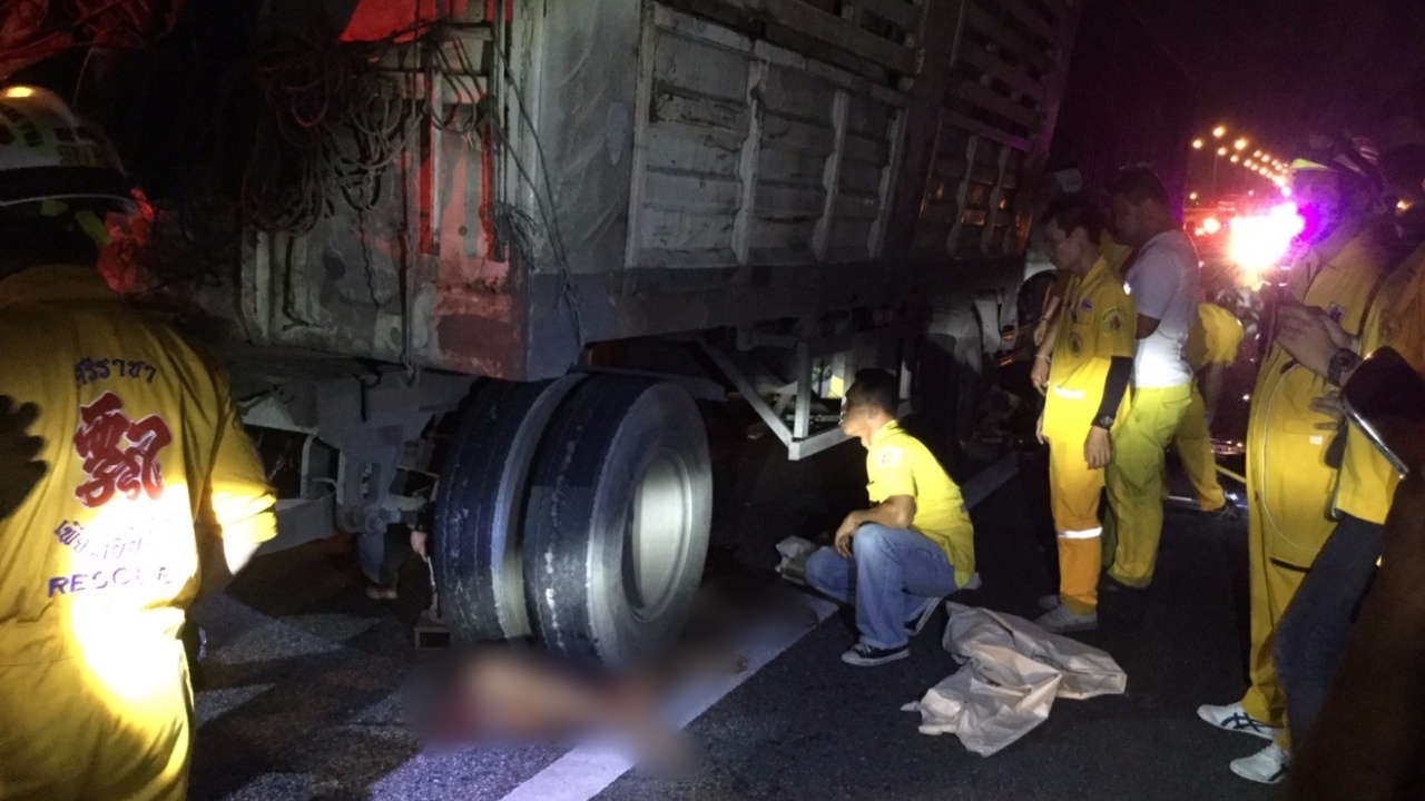 ในที่เกิดเหตุพบรถพ่วงตู้คอนเทนเนอร์ ยี่ห้อฮีโน่ หัวสีขาว หมายเลขทะเบียนส่วนหัว 60-1013 กทม. และหมายเลขทะเบียนส่วนหาง 60-1242 กทม. สภาพด้านหน้าพังยับเยิน โดยมี นายอนุกูล จันทา อายุ 38 ปี อยู่บ้านเลขที่ 96/63 ต.ตาคี อ.ตาคี จ.นครสวรรค์ เป็นคนขับพุ่งชนท้ายอัดติดกับรถพ่วง 18 ล้อ บรรทุกเศษเหล็ก ยี่ห้อฮีโน่ หัวสีขาว หมายเลขทะเบียนส่วนหัว 70-6494 เพชรบุรี และหมายเลขทะเบียนส่วนหาง 70-0904 ยะลา สภาพด้านท้ายพังยับเยิน โดยมี นายวิวัฒน์ แข่งขัน อายุ 50 ปี อยู่บ้านเลขที่ 9 ตรอกโพธิ์ทอง ต.ในเมือง อ.เมือง จ.สุรินทร์ เป็นคนขับรถ ถูกล้อรถเหยียบร่างฉีกขาดครึ่งท่อนเลือดไหลนองพื้นเสียชีวิตอยู่ใต้ท้องรถ และมีนางไอนิล ทามิ อายุ 40 ปี ภรรยาของผู้ตาย ยืนร้องไห้เสียใจอยู่พร้อมกับลูกชายวัยขวบเศษอยู่ในที่เกิดเหตุ หน่วยกู้ภัยได้ช่วยเหลือปฐมพยาบาล นายอนุกูล คนขับรถพ่วงตู้คอนเทนเนอร์ ที่ได้รับบาดเจ็บที่ขาซ้าย มีแผลฉีกขาดที่ขาทั้งสอง ก่อนนำตัวส่งโรงพยาบาลสมเด็จพระบรมราชเทวี ณ ศรีราชา
