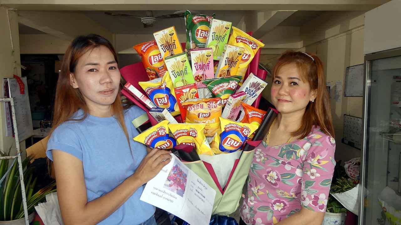 ต่อมาทางร้านได้นำช่อดอกไม้ธนบัตรไปส่งมอบให้กับ นายเอกทัศน์ อภินันทกุล หรือ คุณหนุ่ม อายุ 45 ปี ลูกค้าในพื้นที่ ต.โพหัก อ.บางแพ จ.ราชบุรี ก่อนที่เจ้าตัวจะนำช่อดอกไม้ธนบัตรมูลค่า 1 แสนบาท ไปมอบให้กับ น.ส.ตรีชฎาภรณ์ อภินันทกุล หรือ คุณปัด อายุ 32 ปี แฟนสาว ในที่ทำงานท่ามกลางเสียงปรบมือของเพื่อนร่วมงาน แสดงความดีใจกับหญิงสาวผู้โชคดี โดยบรรยากาศเป็นไปอย่างสุดหวานโรแมนติก ซึ่งแฟนสาวรับช่อธนบัตรด้วยความงง และยิ้มไม่หุบ จนกระทั่งน้ำตาไหลด้วยความซึ้งใจ