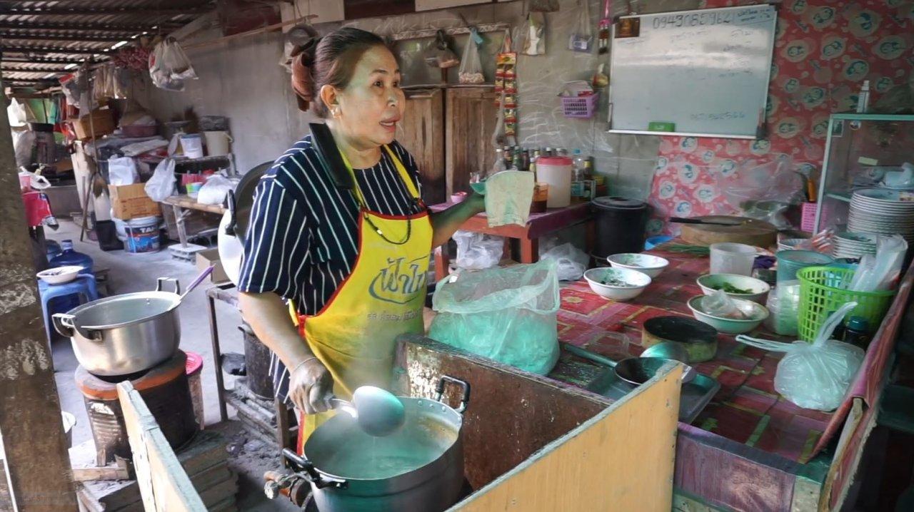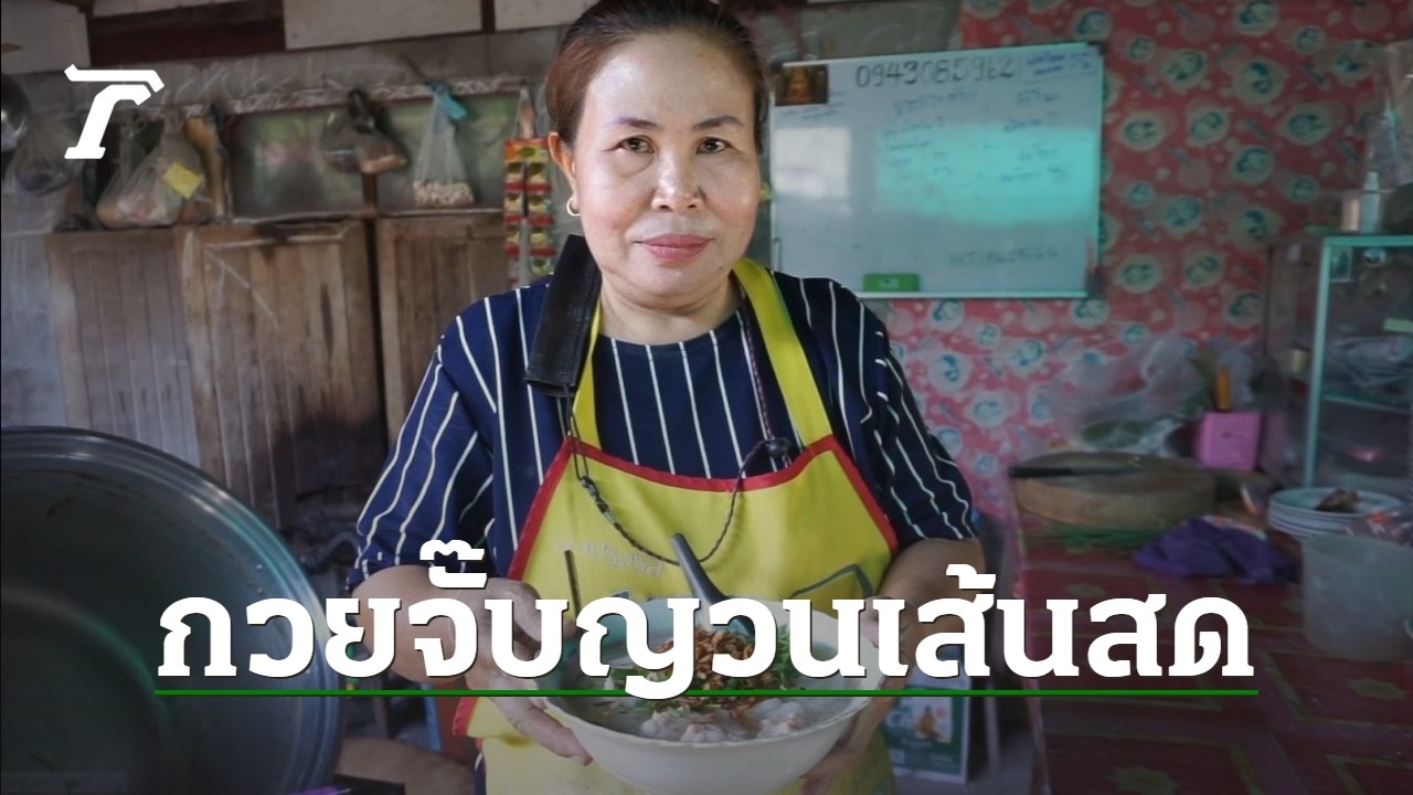 น.ส.ถนอม ละครพล อายุ 53 ปี เจ้าของร้าน กล่าวว่า เมื่อปี 46 ตนเองทำงานโรงงานขนมปังอยู่ที่จังหวัดปทุมธานีได้ 15 ปี ก็อยากลับมาอยู่บ้าน เพราะไม่มีคนอยู่ กลับมาครั้งแรกก็เริ่มมาเปิดขายร้านของชำ เพราะไม่ต้องไปเช่าที่ขาย แต่ก็ขายแล้วรายได้ไม่ค่อยดี เลยได้ปรับเปลี่ยนมาเป็นทำอาหารขายเพราะคนต้องกินทุกวัน ก็คิดค้นสูตรทำกวยจั๊บเส้นสดขายเอง