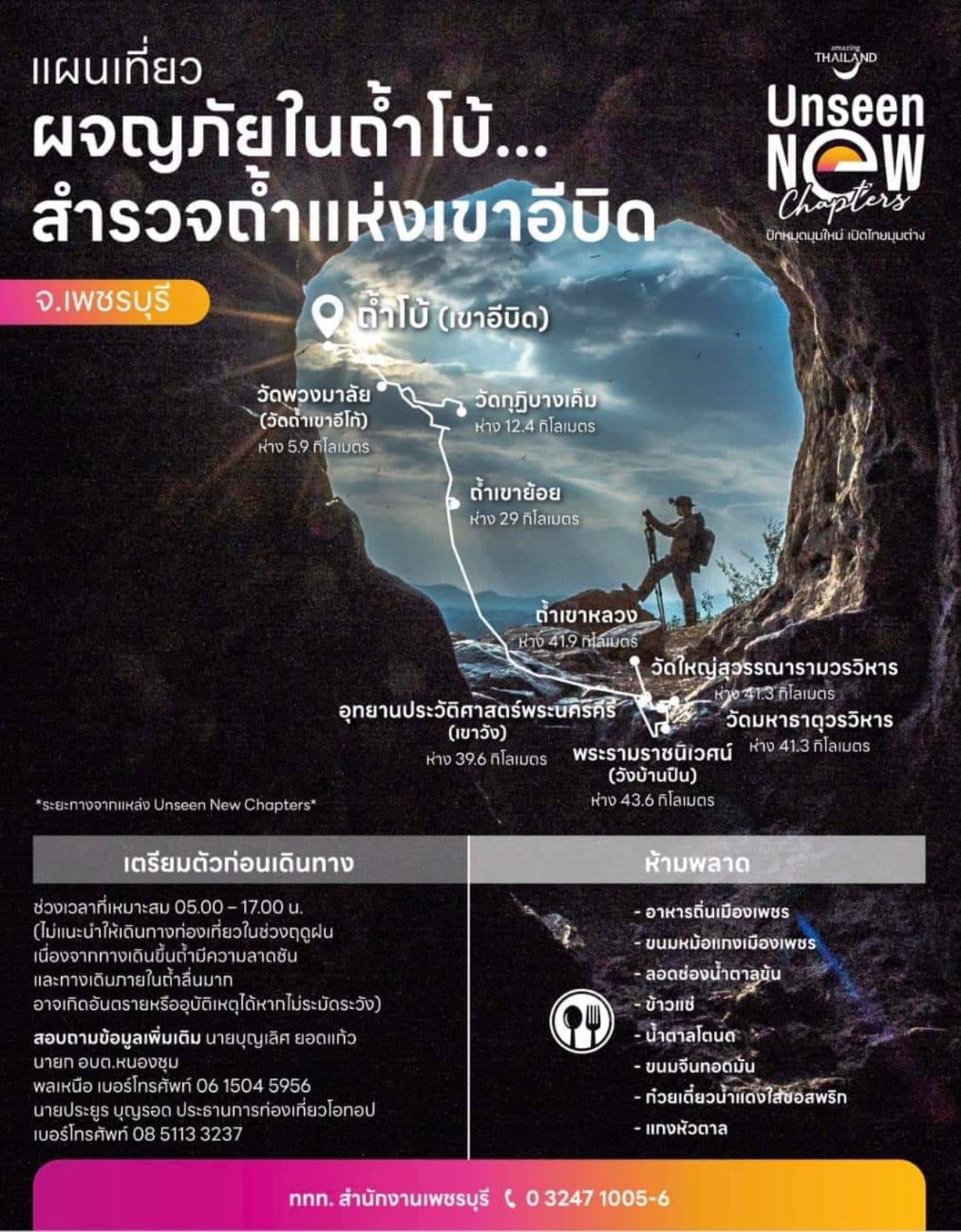 ผู้สื่อข่าวรายงานว่า หลังจากที่การท่องเที่ยวแห่งประเทศไทย ได้ประกาศผล 25 Unseen New Chapters ประจำปี 2566 บทใหม่ของการเดินทางที่จะพาทุกคนไป ปักหมุดมุมใหม่ เปิดไทยมุมต่างในทั่วทุกภาคของประเทศ ซึ่งปีนี้แหล่ง Unseen มีความพิเศษ เพราะมาจากการโหวตคัดเลือกของคนไทยทุกคน โดยหนึ่งใน 25 แหล่งท่องเที่ยวนิวอันซีนมีชื่อ ผจญภัยในถ้ำโบ้…สำรวจถ้ำแห่งเขาอีบิด ถ้ำโบ้ บ้านคีรีวงศ์ อ.เขาย้อย จ.เพชรบุรี ติดอยู่ด้วย