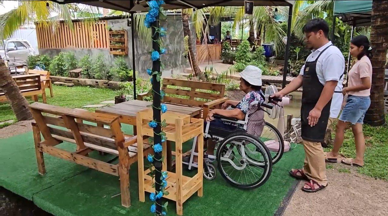 หนุ่มอดีตวิศวกร บ.น้ำมัน ทิ้งเงินเดือนแสน กลับมาดูแลคุณย่า ก่อนผันตัวมาเปิดร้านอาหารในสวนมะพร้าวที่อัมพวา แบบสไตล์บ้านสวน แต่มีเมนูกุ้งมังกรคั่วเกลือและผัดซอสมะขามรสแซ่บ ขายในราคาหลักร้อย แถมออกแบบร้านเพื่อเข็นวีลแชร์เข้าออกสะดวกทุกโต๊ะ