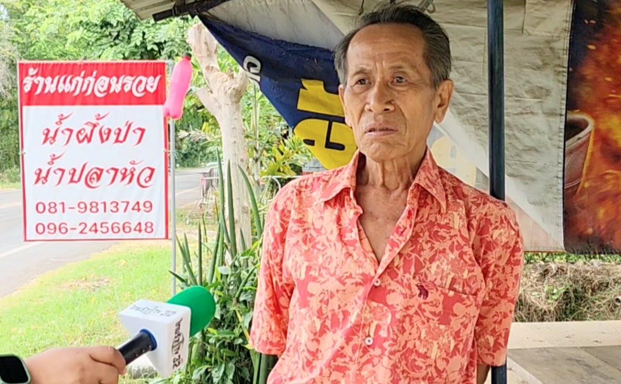นายบุญผ่องกล่าวถึงเรื่องราวที่มาของร้านว่า ตัวเองเคยรับราชการเป็นครู และเกษียณออกมาก็อยู่บ้านทำไร่ทำสวนหลังบ้าน ก็นำของในไร่มาวางขายหน้าบ้านริมถนน ทีแรกไม่มีป้ายชื่อร้าน ขายไปขายมาลูกค้ามาหาก็บอกไม่ถูก เลยสั่งร้านทำป้ายไวนิลมา 2 แผ่น ติดไว้ริมถนน ส่วนอีกแผ่นยังไม่ได้ติดในบ้าน ส่วนคำว่า "แก่ก่อนรวย" เป็นคำที่คิดมานานแล้ว อยู่ในหัวมาตลอด คล้ายกับความจริงทั่วไป แต่อิงไปทางเชิงเปรียบเปรย ยิ่งทำให้ป้ายร้านน่าสนใจ เจ้าของร้านป้ายบอกว่า ทำป้ายมาเป็นร้อยเป็นพันป้าย ยังไม่เคยเจอป้ายแบบนี้เลย ลุงผ่องเล่าไปยิ้มไปหัวเราะไป และพาเข้าไปชมในบ้านที่เก็บของที่ขาย อาทิ ถ่านใส่ถุงปุ๋ยกองไว้ ลูกมะพร้าวน้ำหอม ดีปลี สุ่มไก่ ขวดหน่อไม้ดองเอง ผลไม้ในไร่ในสวน น้ำผึ้งป่าแท้ๆ แถมยังเป็นแฟนไทยรัฐอีกด้วย