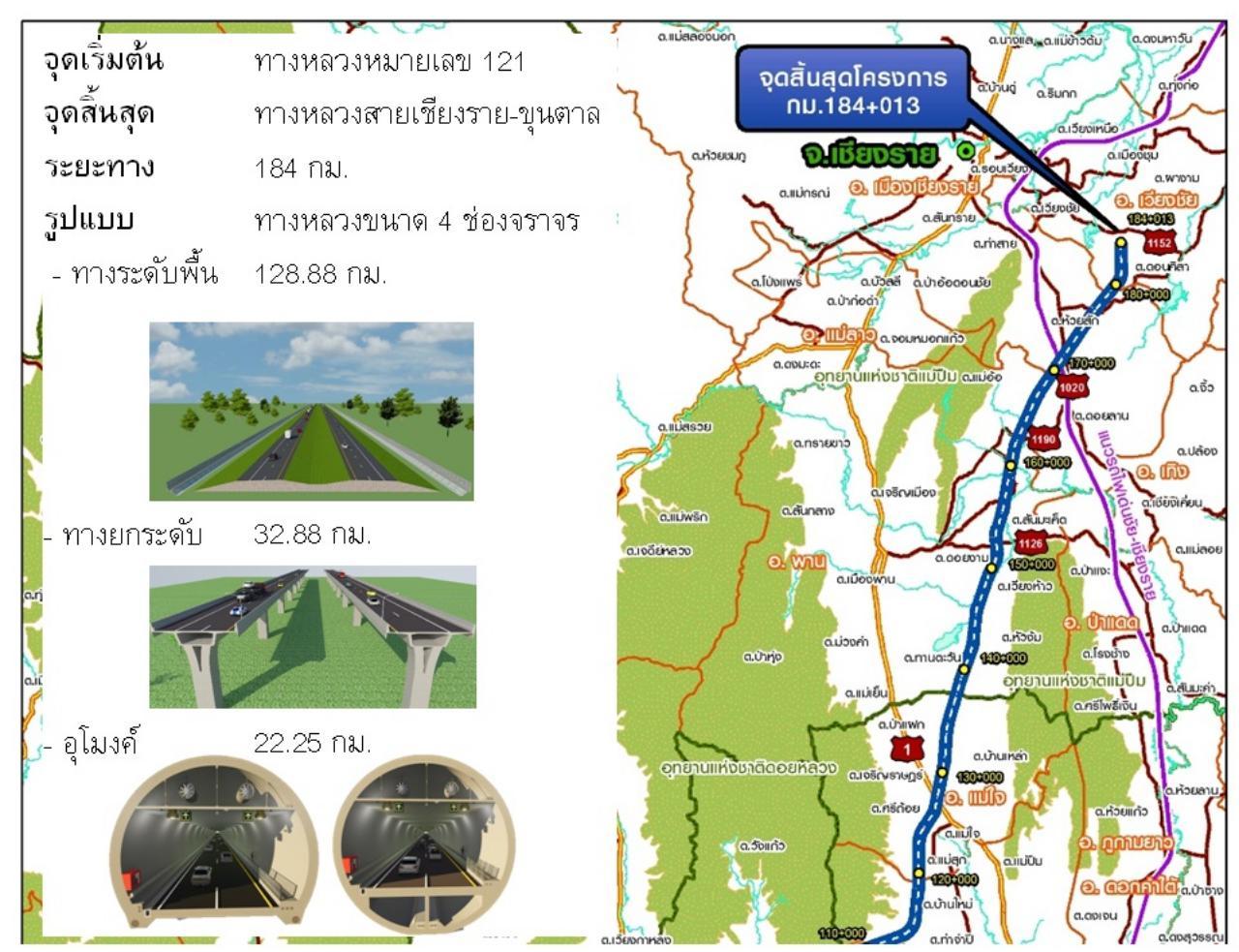 โดยโครงการดังกล่าวเมื่อดำเนินการแล้วเสร็จจะสามารถลดเวลาเดินทาง จ.เชียงใหม่-จ.เชียงราย ได้ 45 นาที หรือจาก จ.พะเยา-จ.เชียงราย ลดเวลาลงได้ 40 นาที และจาก จ.ลำปาง-จ.เชียงราย ลดเวลาลง 1 ชั่วโมงเศษ เมื่อเปรียบเทียบกับการเดินทางบนทางหมายเลข 118 โดยเส้นทางสายดังกล่าวอาจจะไม่ใช่ หรือไม่ได้สร้างในลักษณะที่แสดงไว้ทั้งหมด เพราะยังมีโอกาสที่จะเปลี่ยนแปลงได้.