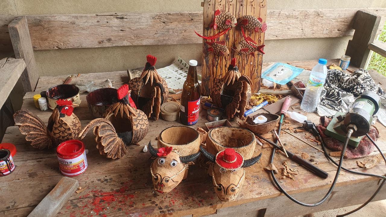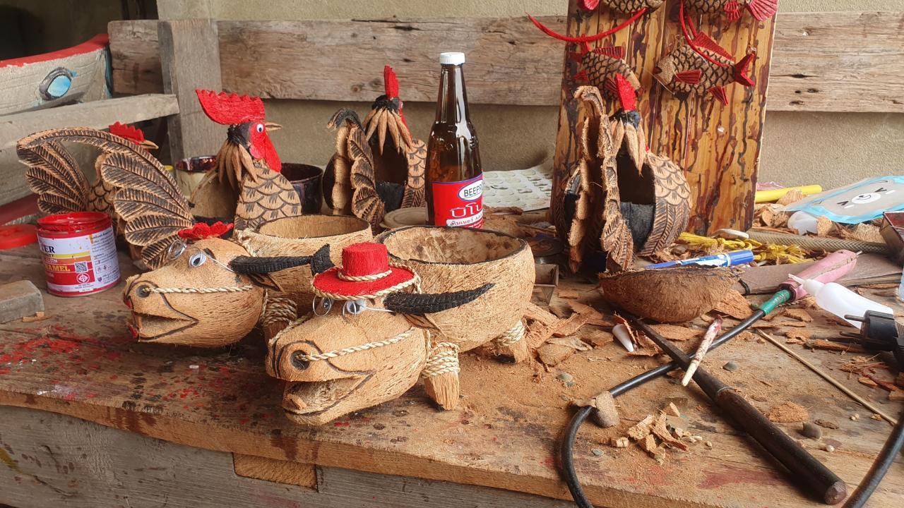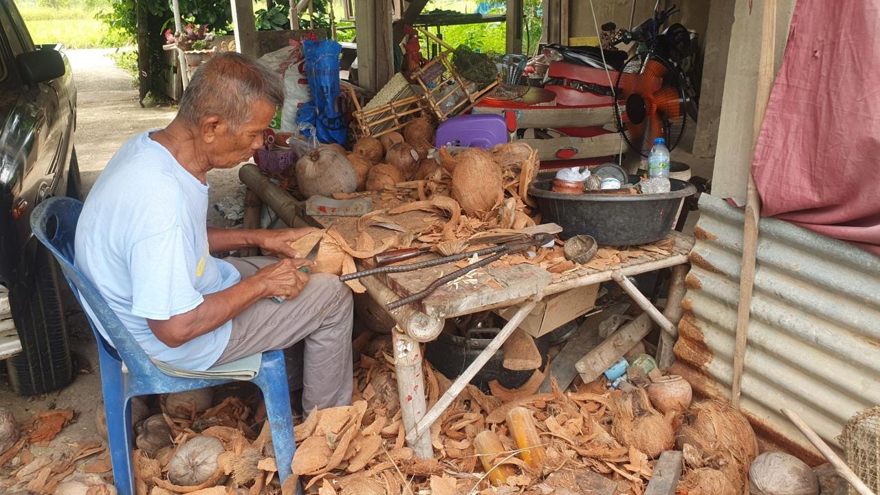 ผู้สื่อข่าวรายงานว่า มะพร้าวเป็นหนึ่งในผลไม้ที่หาง่ายในท้องถิ่น และส่วนต่างๆ ของมะพร้าวสามารถใช้ประโยชน์ได้ทุกส่วน เช่น ผลอ่อนนำมารับประทานได้ เนื้อมะพร้าวที่เป็นผลแก่นำไปคั้นเป็นน้ำกะทิปรุงอาหาร และนำไปใช้ทำขนมได้หลายชนิด และใช้สกัดเป็นน้ำมัน ส่วนเปลือกของมะพร้าวที่เหลือสามารถเอาไปแยกแล้วนำเส้นใยมาทำเชือก ส่วนกะลามะพร้าวก็สามารถนำมาทำเป็นภาชนะ และเป็นของใช้ภายในบ้าน เพราะกะลามะพร้าวเมื่อขัดเงาจะมีความสวยงามมาก ซึ่งสามารถนำมาทำสิ่งประดิษฐ์ของใช้จากกะลา เพื่อนำมาตกแต่งบ้านเรือน และสถานที่ต่างๆ ก็จะทำให้เกิดความสวยงามแก่ผู้พบเห็นได้