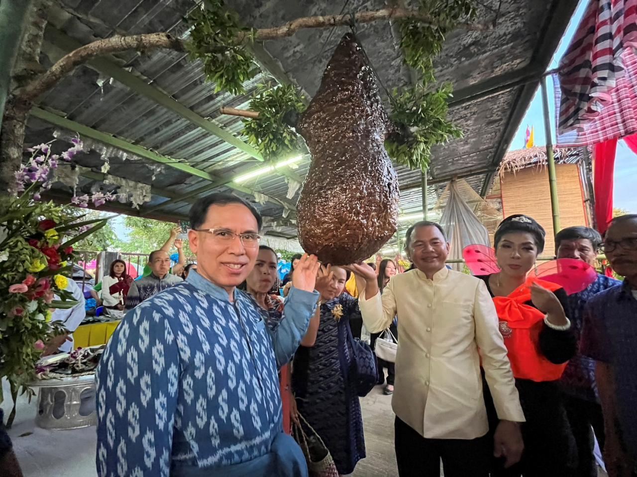 ที่สำคัญไม่เพียงผลผลิตจากลูกต่อหัวเสือที่นำมาปรุงเป็นเมนูเด็ด ยังมีรังต่อหัวเสือ ที่มีรูปร่างสวยงาม ชาวบ้านจะไม่เก็บผลผลิต แต่จะใช้วิธีภูมิปัญญาชาวบ้าน ให้ตัวแม่ต่อหัวเสือออกจากรังจนร้าง ก่อนนำมาสตัฟฟ์ ให้เกิดความสวยงาม นำเป็นวัตถุมงคล เครื่องรางของขลัง เชื่อกันว่า เป็นเครื่องนำโชคลาภ ต่อเงินต่อทอง ทำให้มีราคาซื้อขาย รังละประมาณ 10,000-20,000 บาท ถือเป็นเครื่องรางนำโชคหายาก เป็นการเพิ่มมูลค่าให้กับรังต่อหัวเสือ สร้างรายได้กับชาวบ้าน เงินหมุนเวียนสะพัด และในอนาคตจะมีการพัฒนาจัดงานส่งเสริมการท่องเที่ยวให้ยิ่งใหญ่มากขึ้น รวมถึงให้ประชาชนหันมาเลี้ยงสร้างรายได้เสริมตลอดปี.