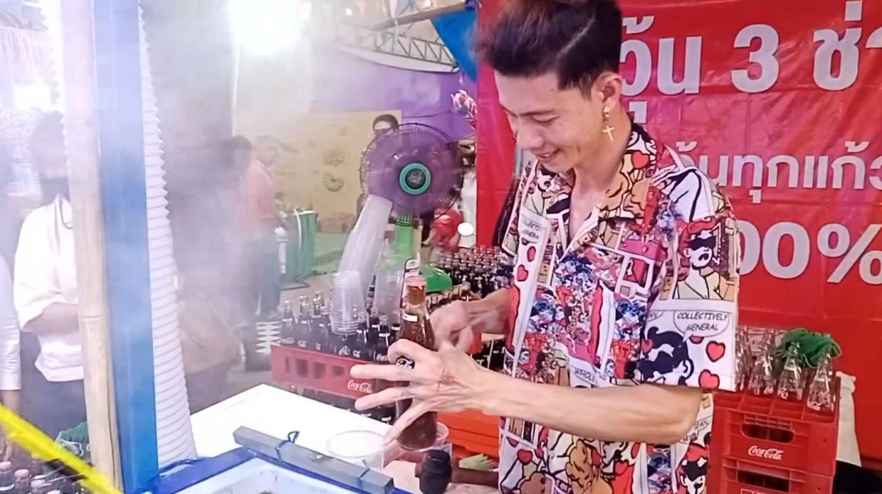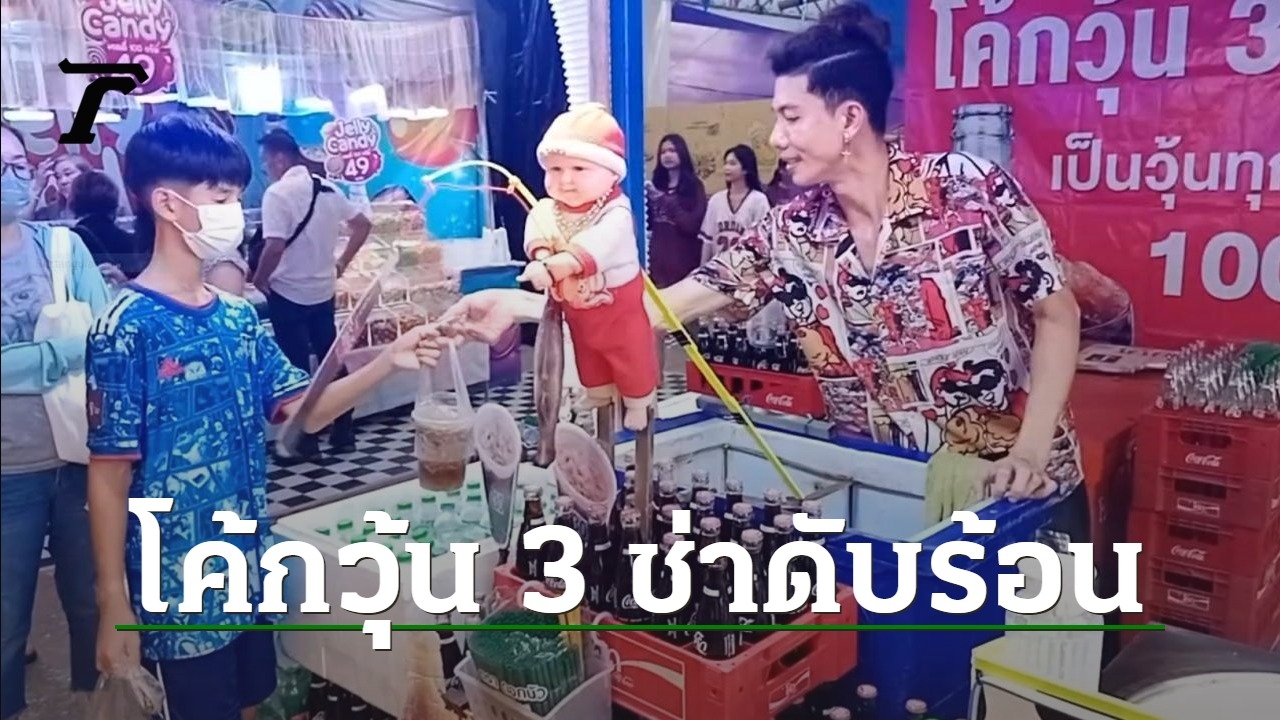 แต่ที่คึกคักส่งเสียงดังในจังหวะ 3 ช่าก็ คือ ร้านโค้กวุ้น 3 ช่า วุ้นทุกแก้ว มีนายอุชุกร ดีประเสริฐ บ้านอยู่ อ.แม่กลอง จ.สมุทรสงคราม เป็นเจ้าของร้าน เป็นร้านเครื่องดื่มมีคนรุมซื้อคึกคัก โดยนายอุชุกรจะขวดโค้กที่แช่เย็นแล้ว ก่อนจะเปิดขวดต้องนำเหล็กมาเคาะกับขวด และทุบกับลังน้ำแข็งเป็นจังหวะ 3 ช่า ซึ่งนายอุชุกร เปิดเผยว่า การเคาะขวดเพื่อให้น้ำโค้กในขวดเป็นวุ้น เมื่อเคาะเสร็จเปิดขวดเทน้ำออกก็จะกลายเป็นวุ้นเทออกง่าย แต่ถ้าไม่เคาะน้ำที่เป็นวุ้นจะเทออกยากและวุ้นจะติดในขวด โดยขายไม่แพงราคาแก้วละ 30 บาทเท่านั้น