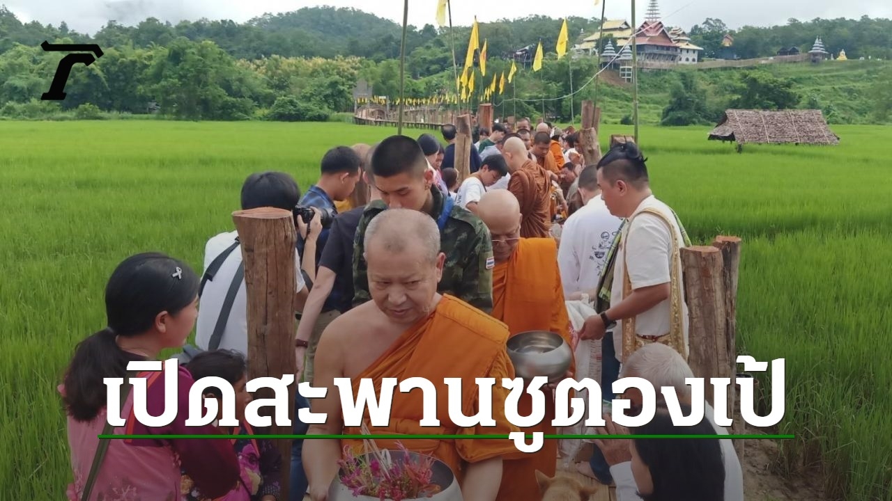 เมื่อเวลา 07.00 น. วันที่ 14 ต.ค. 66 พระปลัดจิตตพัฒน์ อัคคปัญโญ เจ้าอาวาสวัดภูสมะณาราม ต.ปางหมู อ.เมือง จ.แม่ฮ่องสอน พร้อมด้วยคณะศรัทธา ทำพิธีเปิดสะพานซูตองเป้ ที่จัดสร้างขึ้นมาใหม่ทอดข้ามทุ่งนาข้าวที่กำลังเขียวขจีระยะทาง 800 เมตร หลังถูกน้ำป่าหลากพัดสะพานขาดครึ่ง เสาตอม่อถูกแรงดันน้ำจนเอียง เหตุเกิดช่วงต้นเดือนกันยายนที่ผ่านมา ต้องรื้อสะพานสร้างใหม่ทั้งหมด ใช้เวลาก่อสร้างจนแล้วเสร็จรวม 17 วัน โดยมีหน่วยงานราชการ ทหาร อส. นักศึกษา และชาว ต.ปางหมู ร่วมศรัทธาออกแรงในการก่อสร้าง ใช้เงินงบประมาณดำเนินการจำนวน 1.2 ล้านบาท โครงสร้างสะพานใช้ฐานตอม่อปูนเสาไม้ คานไม้และเหล็กสลับกัน พื้นปูด้วยไม้ไผ่ ยังคงแนวรูปแบบเดิม