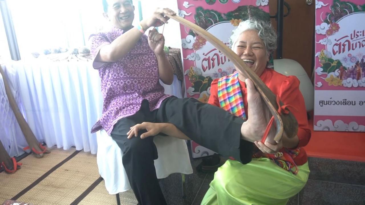 รองผู้ว่าฯ อุทัยธานี ร่วมทดสอบ "ไม้ตาลดัดขา" เครื่องมือนวดของเจ๊ไก่ ถนนคนเดินตรอกโรงยา ชูผลิตจากวัสดุธรรมชาติ เป็นกาบของต้นตาล หลังจากนวดเสร็จแล้วยอมรับว่าเจ็บแต่ดีโล่งตัว โดยทำขายอันละ 300 บาท ใช้นวดได้ทั้งแขนและขา