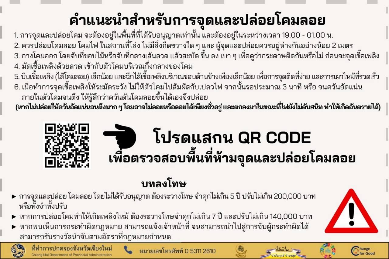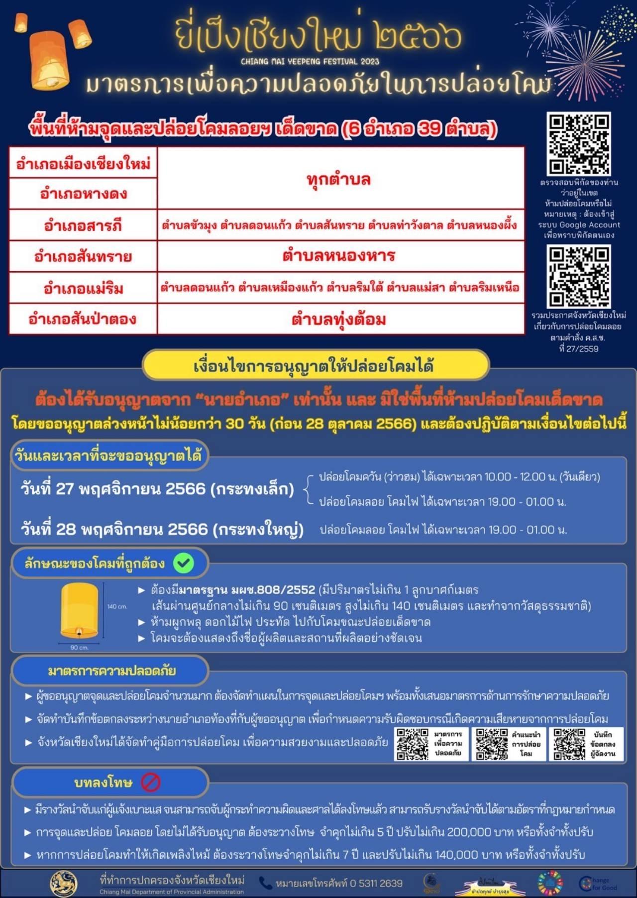จังหวัดเชียงใหม่ ย้ำขอความร่วมมือประชาชน และนักท่องเที่ยว ปล่อยโคมลอยได้ 2 วัน 27-28 พ.ย.66 ในพื้นที่ที่ได้รับอนุญาตแล้วเท่านั้น โดยมี 6 อำเภอ 39 ตำบลห้ามปล่อยเด็ดขาด หากฝ่าฝืนมีโทษทั้งจำทั้งปรับ