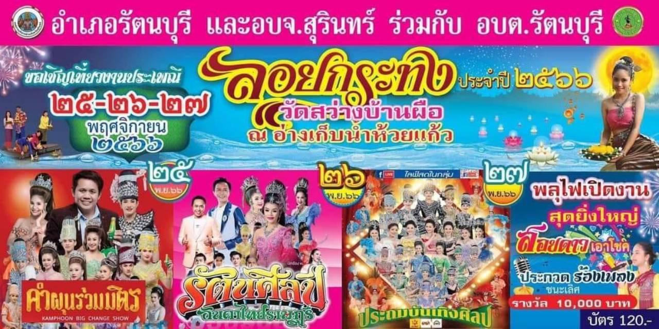 อ.รัตนบุรี จ.สุรินทร์ เตรียมจัดงานประเพณีลอยกระทงปี 66 ทุ่มงบนับล้านจัดบั้งไฟพญานาคจำลอง ที่หาชมได้ยาก ประกวดนางนพมาศ และประกวดกระทงใหญ่วันที่ 25-27 พ.ย. นี้ ที่บริเวณอ่างเก็บน้ำห้วยแก้ว วัดสว่างบ้านผือ