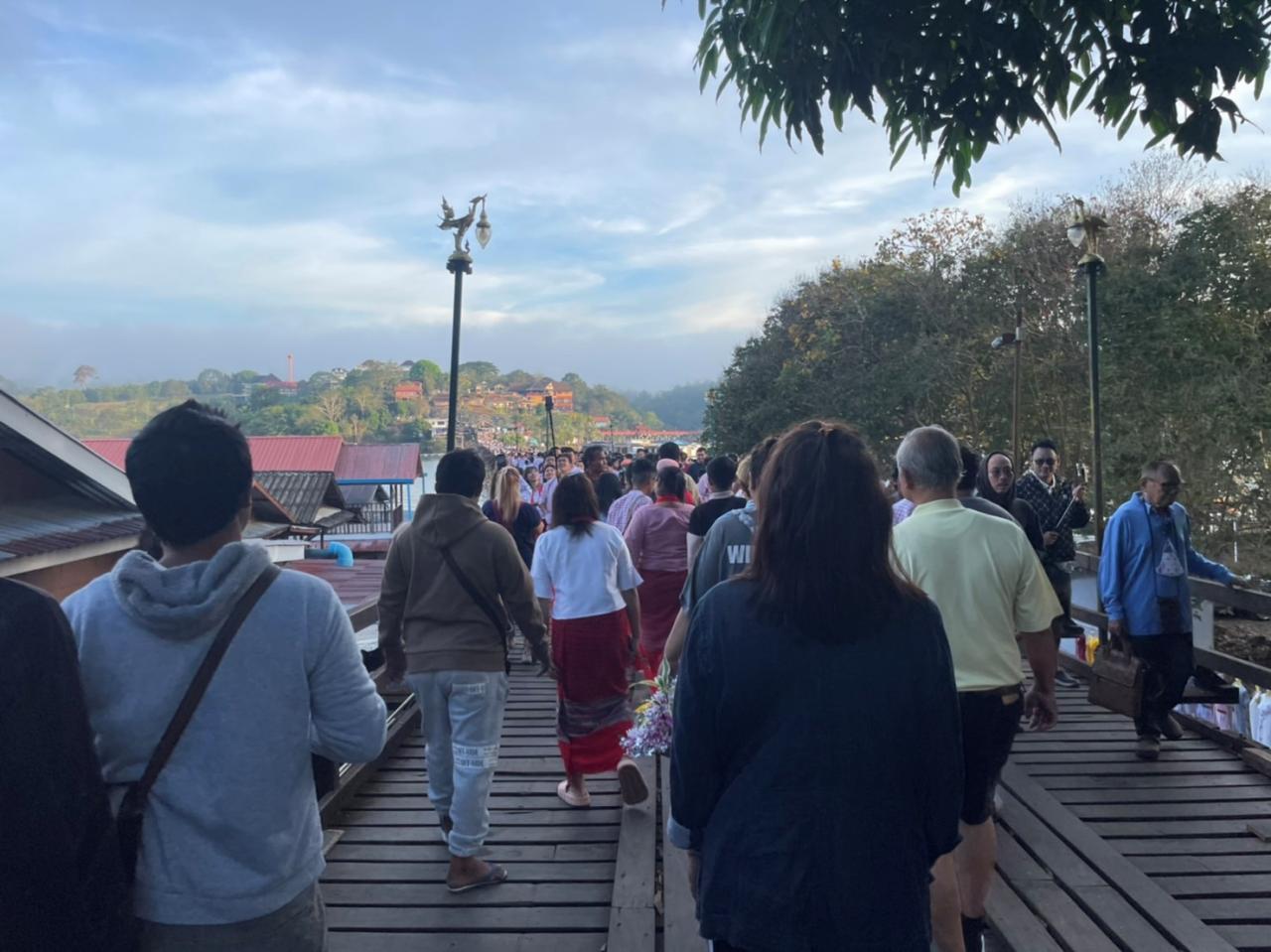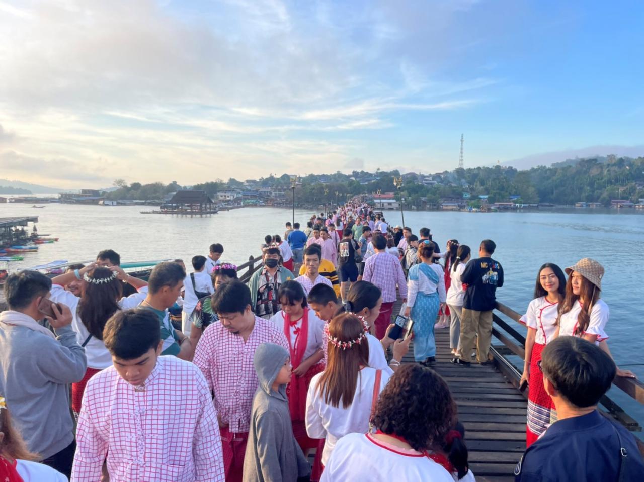 ผู้สื่อข่าวรายงานจากสะพานไม้อุตตมานุสรณ์ หรือสะพานมอญ หมู่ 2 ตำบลหนองลู อำเภอสังขละบุรี จังหวัดกาญจนบุรี ได้มีนักท่องเที่ยวรวมถึงนักท่องเที่ยวต่างชาติ เดินทางมาในช่วงวันปีใหม่ 2567 เป็นวันหยุดยาว ส่วนมากนักท่องเที่ยวจะมากันแบบครอบครัวหรือแบบกลุ่มช่วงเช้า และใส่ชุดท้องถิ่น ได้ใส่บาตรพระภิกษุสงฆ์แล้วเดินเที่ยวชมสะพานมอญ เพื่อถ่ายรูปเก็บเป็นที่ระลึกท่ามกลางบรรยากาศปกคลุมไปด้วยหมอกอากาศหนาวเย็นเหมือน เหมือนเดินบนสะพานอยู่ ในก้อนเมฆ