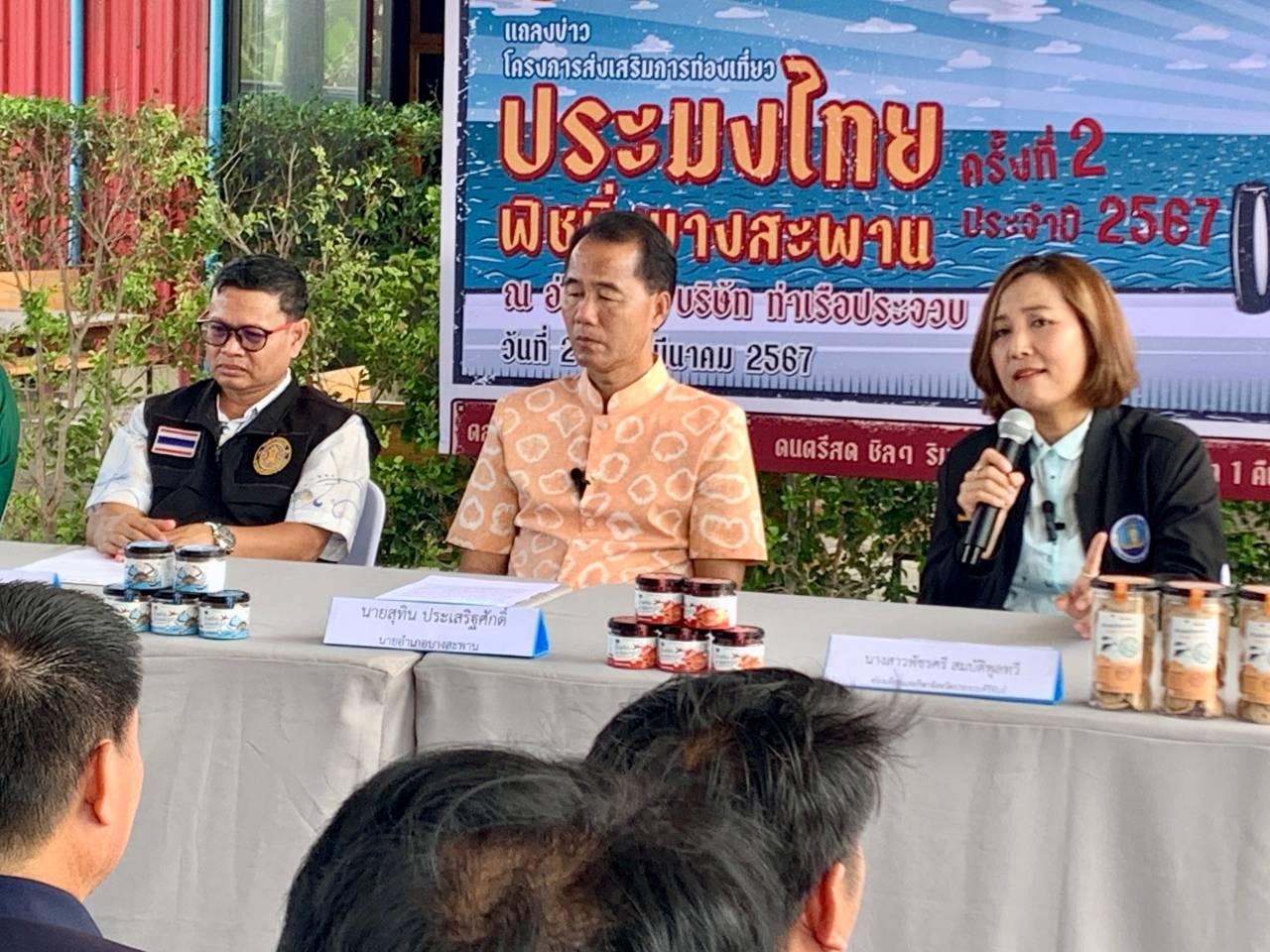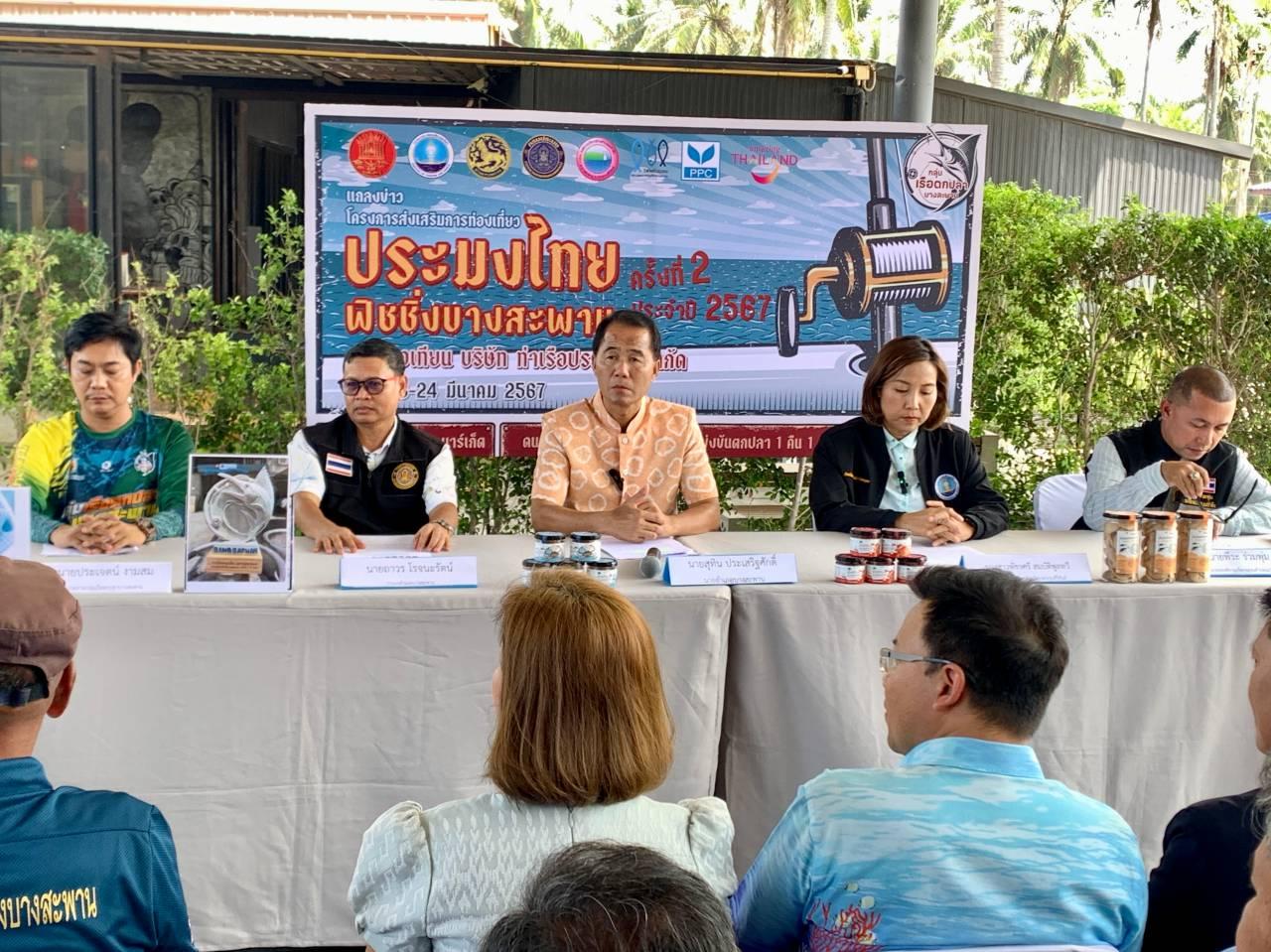 เมื่อเวลา 14.00 น. วันที่ 13 มีนาคม 2567 ที่สมาคมประมงบางสะพาน ต.แม่รำพึง อ.บางสะพาน จ.ประจวบคีรีขันธ์ นายสุทิน ประเสริฐศักดิ์ นายอำเภอบางสะพาน, น.ส.พัชรศรี สมบัติพูลทวี ท่องเที่ยวและกีฬาจังหวัดประจวบคีรีขันธ์, นายถาวร โรจนะรัตน์ ประมงอำเภอบางสะพาน, นายพีระ ร่วมพุ่ม รองนายกฯ อบต.แม่รำพึง, นายประเจตน์ งามสม ประธานกลุ่มเรือตกปลาบางสะพาน และนายนันทชัย สุขเกื้อ นายกสมาคมประมงบางสะพาน ร่วมกันแถลงข่าว โครงการส่งเสริมการท่องเที่ยว “ประมงไทยฟิชชิ่งบางสะพาน ครั้งที่ 2” ที่จะจัดขึ้นในวันที่ 23-24 มีนาคม 2567 ณ อ่าวเทียน บจก.ท่าเรือประจวบ