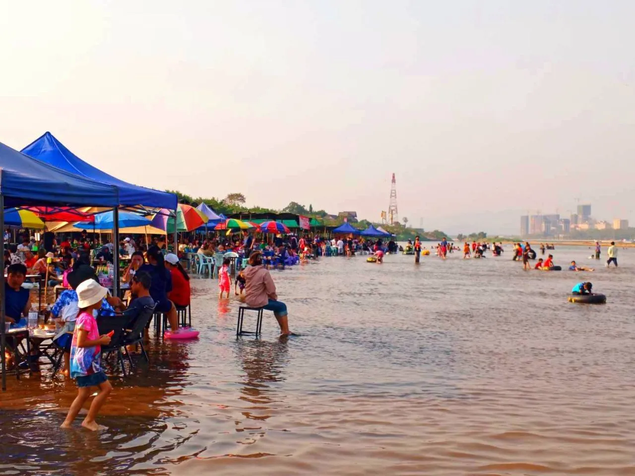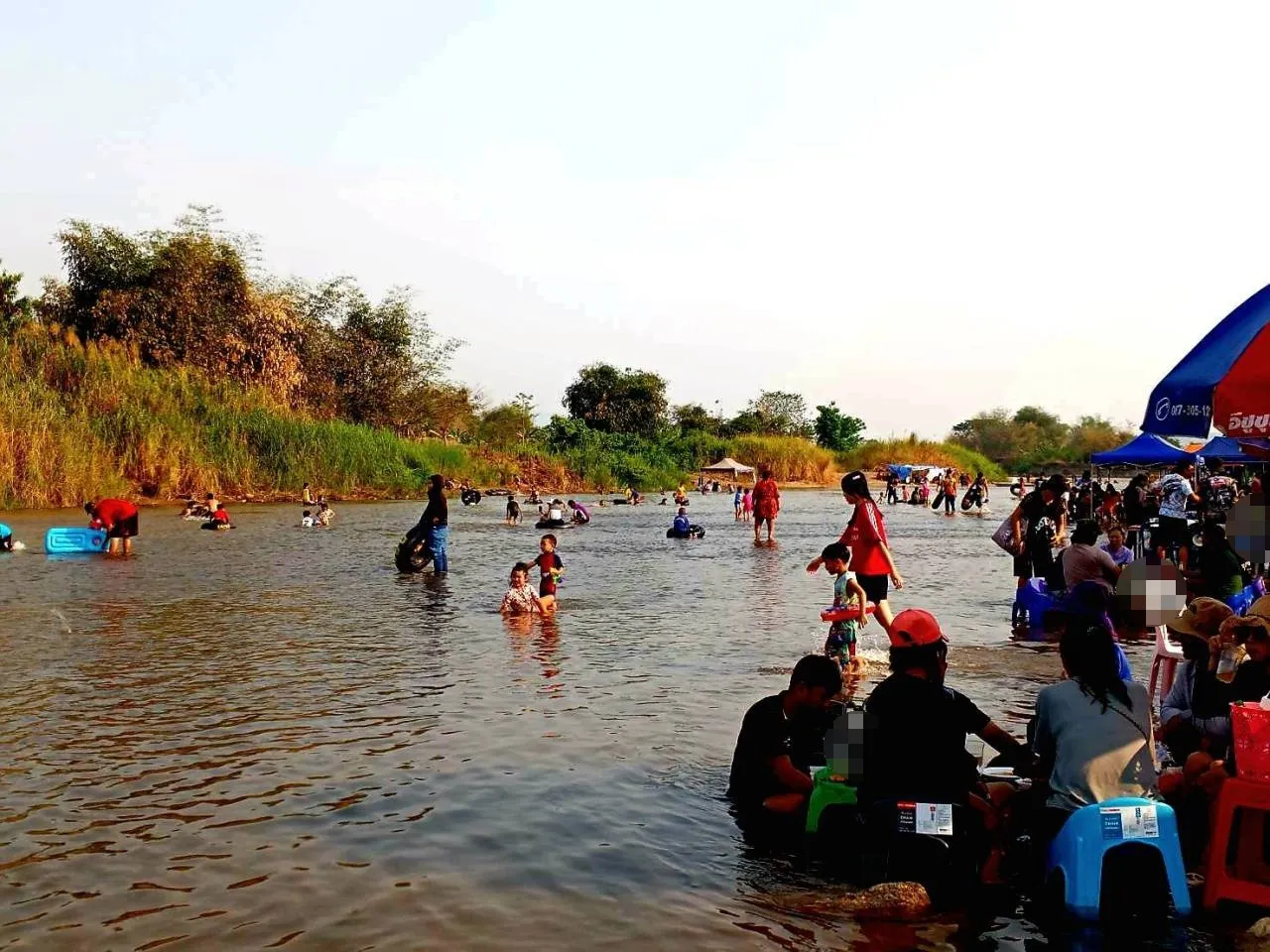 จุดนี้เป็นหาดทรายขาว มีพื้นที่กว้าง เหมาะสำหรับลงเล่นน้ำเพื่อคลายร้อน บางคนเล่นน้ำอย่างสนุกสนาน บางคนตั้งวงกินอาหาร-เครื่องดื่มบนหาดทรายริมฝั่งแม่น้ำโขง และนั่งตามซุ้มของร้านค้าที่จัดบริการ ต่างขายดีกันทั่วหน้า สร้างรายได้ให้กับชุมชน ทำเงินสะพัดในพื้นที่ สร้างความรักความอบอุ่นในครอบครัว ท่ามกลางการรักษาความปลอดภัยของเจ้าหน้าที่อย่างเข้มงวด