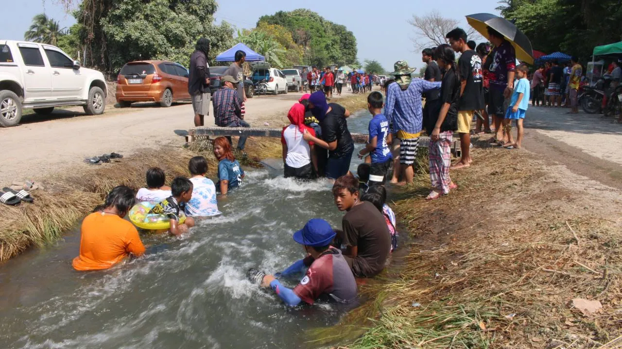 ผู้สื่อข่าวรายงานว่า จากสภาพอากาศที่ร้อนระอุ อุณหภูมิสูงถึง 40 กว่าองศา ทำให้ชาวบ้านในตำบลดอนตาเพชร อำเภอพนมทวน จังหวัดกาญจนบุรี นักท่องเที่ยวในพื้นที่ และใกล้เคียงต่างพากันแห่มาลงเล่นน้ำคลายร้อนกันอย่างคึกคักในแน่น คลองตาบ๊อก ซึ่งเป็นคลองส่งน้ำไส้ไก่ อยู่บริเวณท้ายหมู่บ้านดอนตาเพชร จึงเป็นการเล่นน้ำแบบสไลเดอร์ ผู้ลงเล่นต่างบอกว่าน้ำแรงมาก ผู้ลงเล่นต้องใช้รองเท้าสวมใส่มือเพื่อชะลอกับพนังริมคลอง หลายคนบอกว่ากางเกงขาดจากแรงน้ำ แล้วใช้ก้นชะลอกับพนังริมคลองเพื่อหยุด แต่ก็สนุกสนานมาก