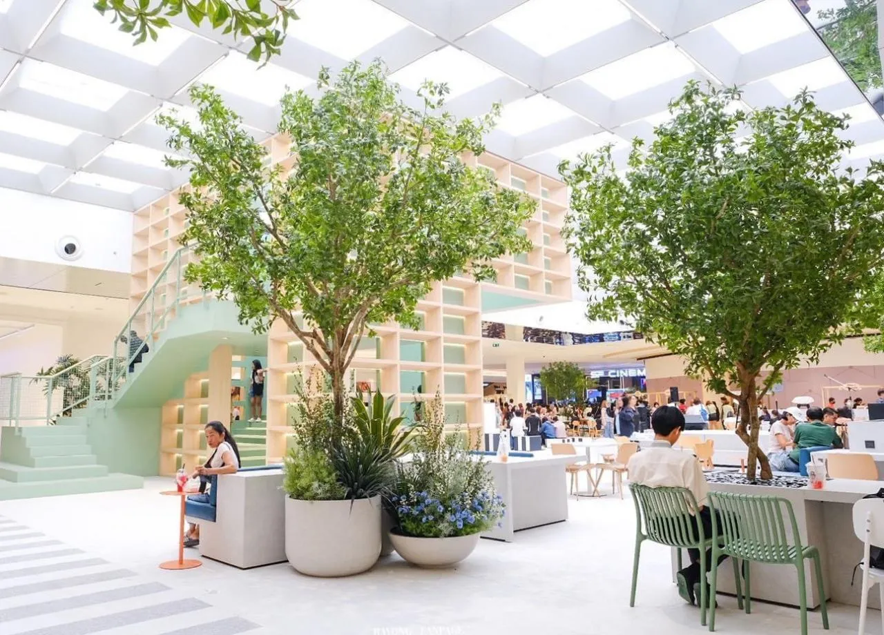 สำหรับการรีโนเวตของพื้นที่ดังกล่าว เราได้ออกแบบให้ศูนย์การค้าเข้ากับธรรมชาติมากขึ้น แต่ยังคงมีความทันสมัยไปในตัว เน้นความโปร่งสบาย มีพื้นที่สีเขียวให้พักผ่อนหย่อนใจ ทั้งโซน Co-Living Space และพื้นที่ Semi Outdoor พร้อมกับ Rest Area ที่สามารถเดินออกไปชมวิวด้านนอกที่มองเห็นทะเลของจังหวัดระยองได้