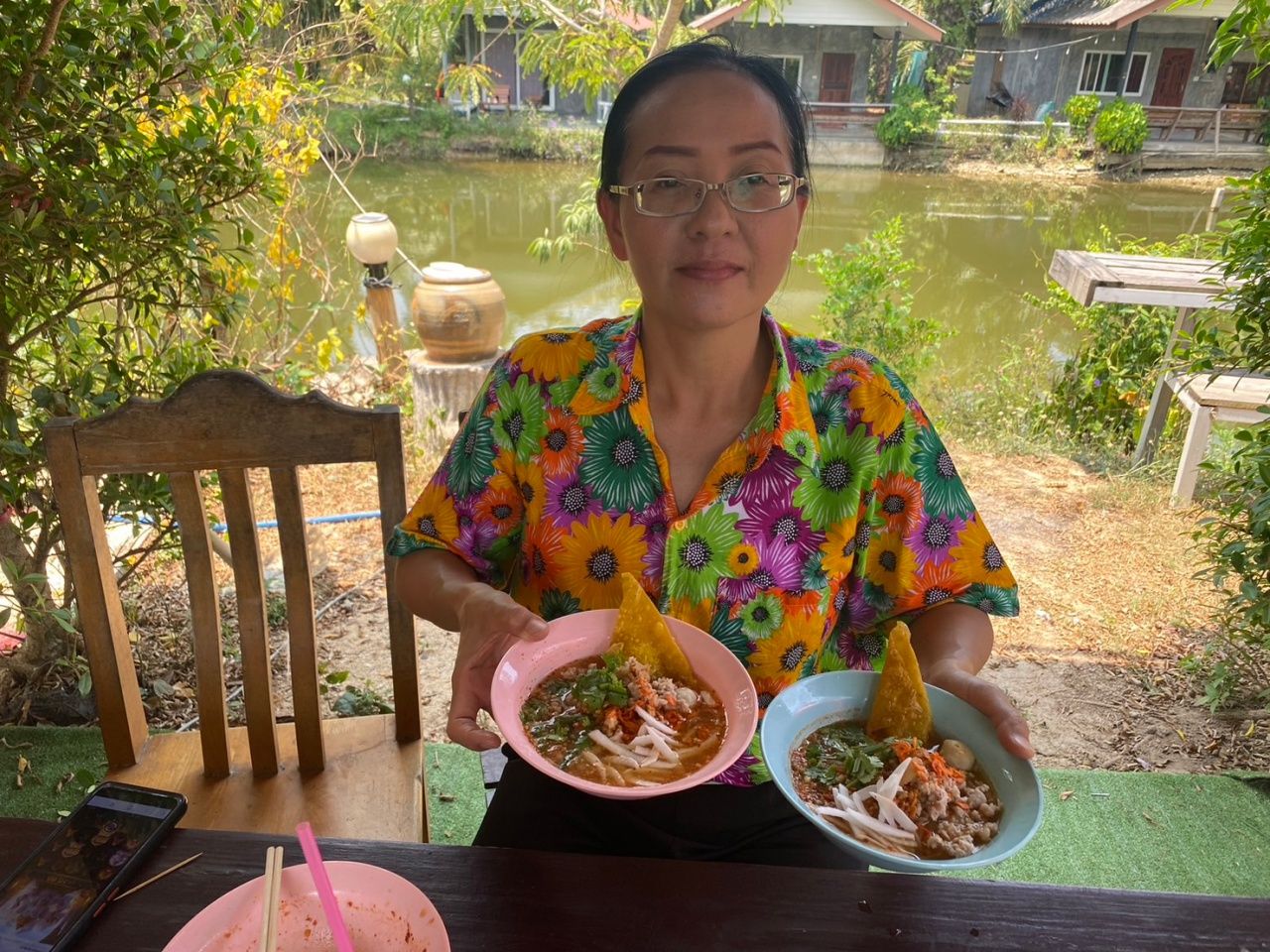 "ที่ใช้น้ำมะพร้าวแทนน้ำ เนื่องจากในท้องถิ่นมีมะพร้าวมาก โดยเฉพาะมะพร้าวน้ำหวาน จึงใช้น้ำมะพร้าวแทนน้ำ ลองทำกินเองพบว่ารสชาติของน้ำซุปมีรสที่หวานละมุน ลูกค้าไม่ต้องเติมน้ำตาล ซึ่งบางครั้งหากลูกค้าต้องการทานเนื้อมะพร้าวอ่อน ก็จะใส่ให้ในถ้วยก๋วยเตี๋ยวเลย ช่วงเทศกาลวันสงกรานต์พนักงานหยุด ไม่ได้เปิดขายให้กับลูกค้าทั่วไป แต่บริการก๋วยเตี๋ยวสูตรน้ำมะพร้าวอ่อนให้กับนักท่องเที่ยวที่มาพัก ซึ่งนักท่องเที่ยวต่างชมว่ารสชาติก๋วยเตี๋ยวต้มยำอร่อยมากๆ" นางจำปี กล่าว