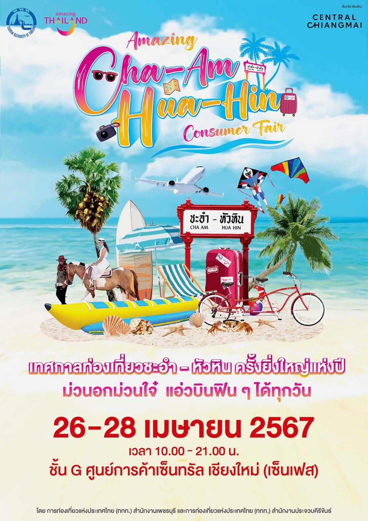 เมื่อวันที่ 19 เมษายน 2567 ผู้สื่อข่าวรายงานว่า การท่องเที่ยวแห่งประเทศไทย (ททท.) สำนักงานเพชรบุรี การท่องเที่ยวแห่งประเทศไทย และ ททท. สำนักงานประจวบคีรีขันธ์ ททท.สำนักงานเชียงใหม่ และสมาคมธุรกิจการท่องเที่ยวหัวหิน-ชะอำ ร่วมกับสายการบินแอร์เอเชีย ร่วมกันจัดงาน “Amazing Cha-Am - Hua Hin Consumer Fair” ม่วนอกม่วนใจ๋ แอ่วบินฟินได้ทุกวัน นำผู้ประกอบการท่องเที่ยวชั้นนำกว่า 20 ราย ในพื้นที่ชะอำและหัวหิน จากทะเลขึ้นเหนือ ไปร่วมเทศกาลท่องเที่ยวแห่งปี ส่งเสริมการขายกลุ่มตลาดนักท่องเที่ยวเชียงใหม่และชาวเหนือ ระหว่างวันที่ 26-28 เมษายน 2567 ที่ศูนย์การค้าเซ็นทรัลเฟสติวัล เชียงใหม่ ชั้น G อ.เมือง จ.เชียงใหม่