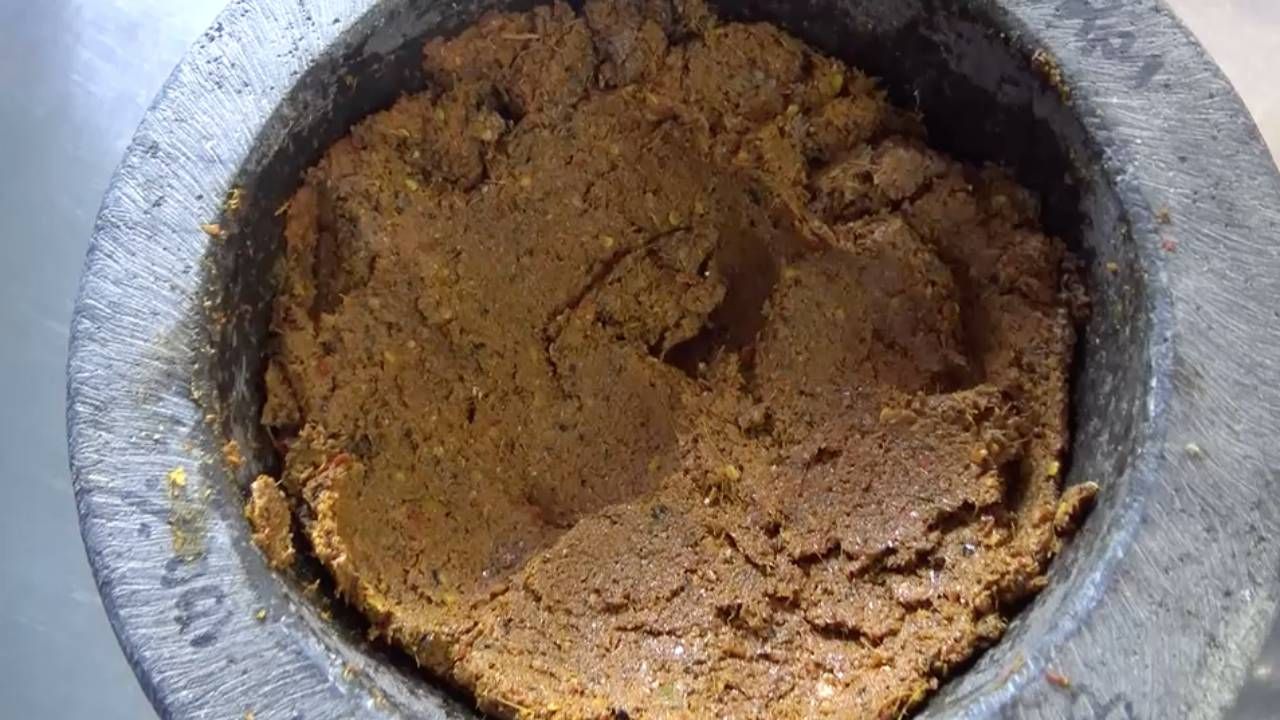 1.ใส่พริกแห้งตำให้ละเอียด แล้วใส่ผิวมะกรูด ตะไคร้สับและขมิ้น โขลกให้ละเอียด ตามด้วยหอมแดง, กระเทียม ส่วนพริกไทยขาว พริกไทยดำ ให้โขลกแยกแล้วใส่ทีหลังสุด ตำเครื่องแกงทั้งหมดให้ละเอียดเข้ากันดี