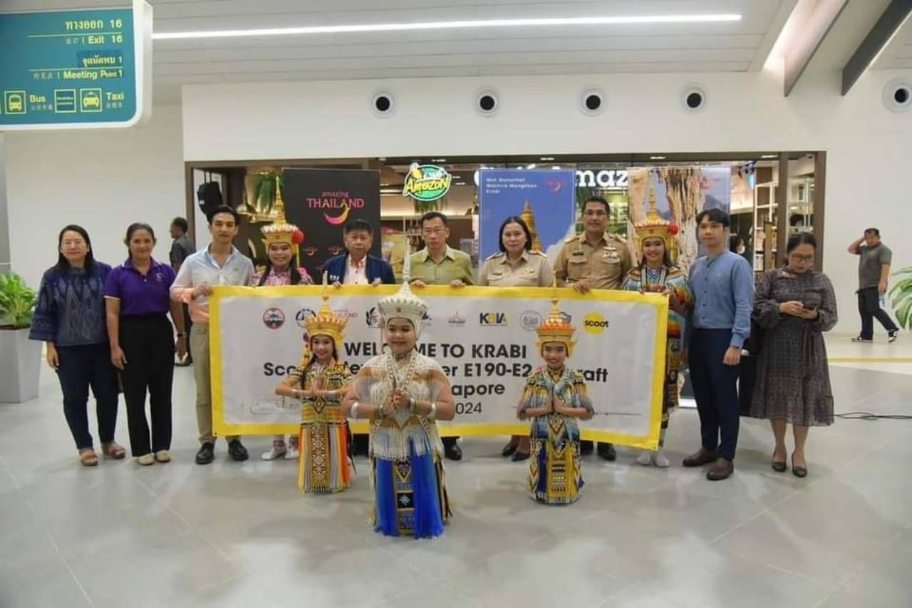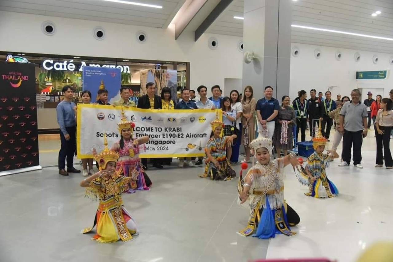 เมื่อวันที่ 7 พ.ค. 2567 ที่ท่าอากาศยานนานาชาติกระบี่ นายสมชาย หาญภักดีปฏิมา ผวจ.กระบี่ พร้อมด้วย นายกิติชัย สัจจลักษณ์ ผอ.ท่าอากาศยานนานาชาติกระบี่, นางรวีวรรณ แสงจันทร์ รอง ผอ.ททท. สำนักงานกระบี่ ร่วมต้อนรับ นทท.จำนวน 112 คน ที่เดินทางมาจากประเทศสิงคโปร์ ด้วยเครื่องบินลำใหม่ คือ Embraer E190-E2 พร้อมมีการแสดงมโนราห์ต้อนรับเพื่อสร้างความประทับใจให้นักท่องเที่ยว