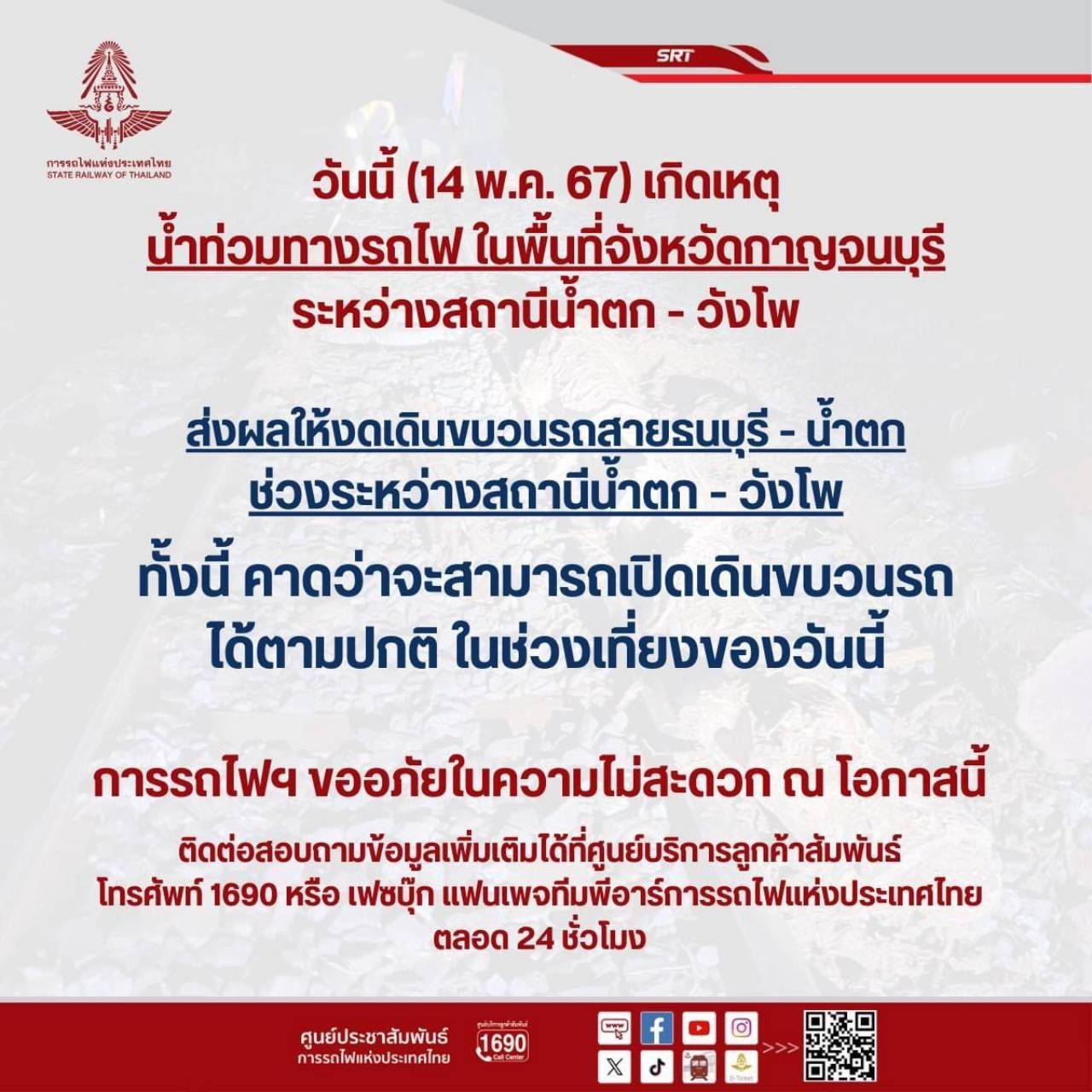 นายเอกรัช ศรีอาระยันพงษ์ หัวหน้าสำนักงานผู้ว่าการ การรถไฟแห่งประเทศไทย แจ้งว่า จากสถานการณ์ฝนตกหนักอย่างต่อเนื่องในหลายพื้นที่ ส่งผลให้เมื่อวันที่ 14 พฤษภาคม 2567 เวลา 00.40 น. มีน้ำไหลเข้าท่วมทางรถไฟ ระหว่างสถานีน้ำตก-วังโพ เขตพื้นที่จังหวัดกาญจนบุรี ส่งผลต่อความไม่ปลอดภัยในการเดินรถ