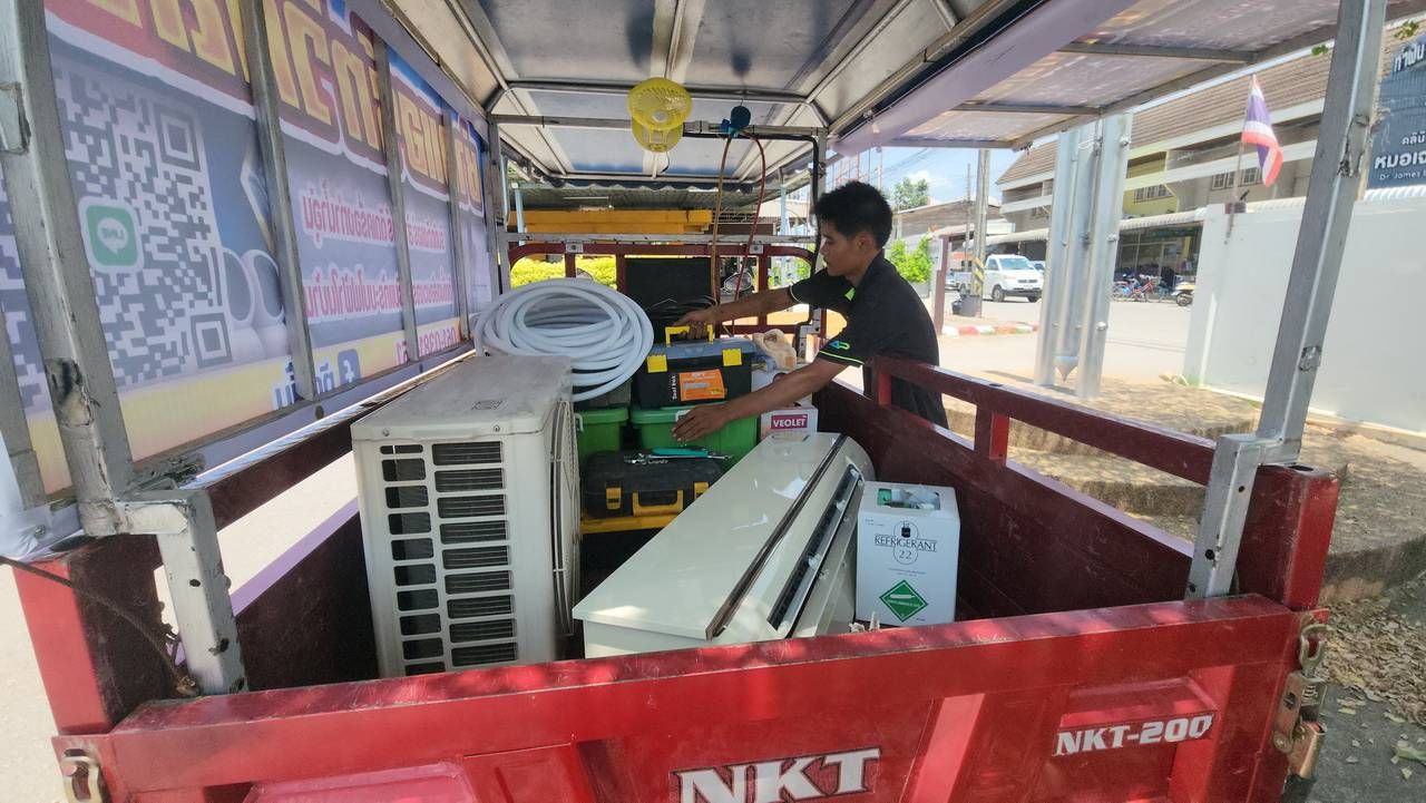 นายทวีศิลป์ ศรีม่น ช่างแอร์หนุ่ม กล่าวว่า ภรรยาของตนกำลังท้องใกล้คลอด โดยกำหนดที่หมอนัดคือในเดือน พ.ค.นี้ จึงได้นำรถสามล้อเครื่องจากแม่ที่ซื้อไว้ในราคา 60,000 บาท ที่จอดไว้ไม่ได้ใช้งาน แม่ให้เอามาใช้ จึงเปิดร้านซ่อมแอร์เคลื่อนที่ ตระเวนซ่อมแอร์ไปทั่วเขตเทศบาลเมืองเลย เพราะเป็นรถเล็กสะดวกสบายในการขี่ และเข้าออกถนนและซอยที่แคบ และประหยัดค่าใช้จ่ายทั้งเรื่องที่จอดรถและน้ำมัน ทุกวันตนกับภรรยาจะออกไปซ่อมแอร์ให้ลูกค้าที่โทรมาเรียก หรือโทรมานัด