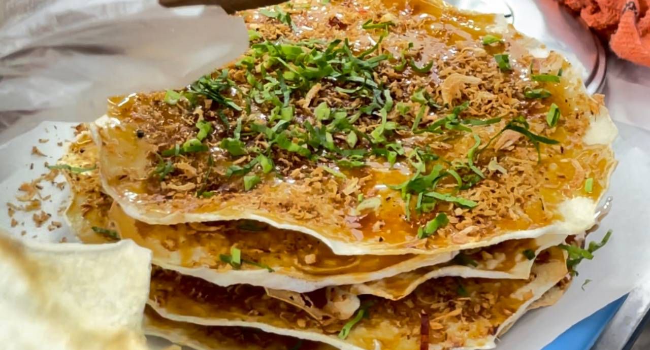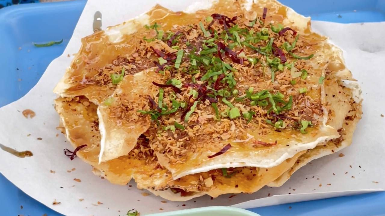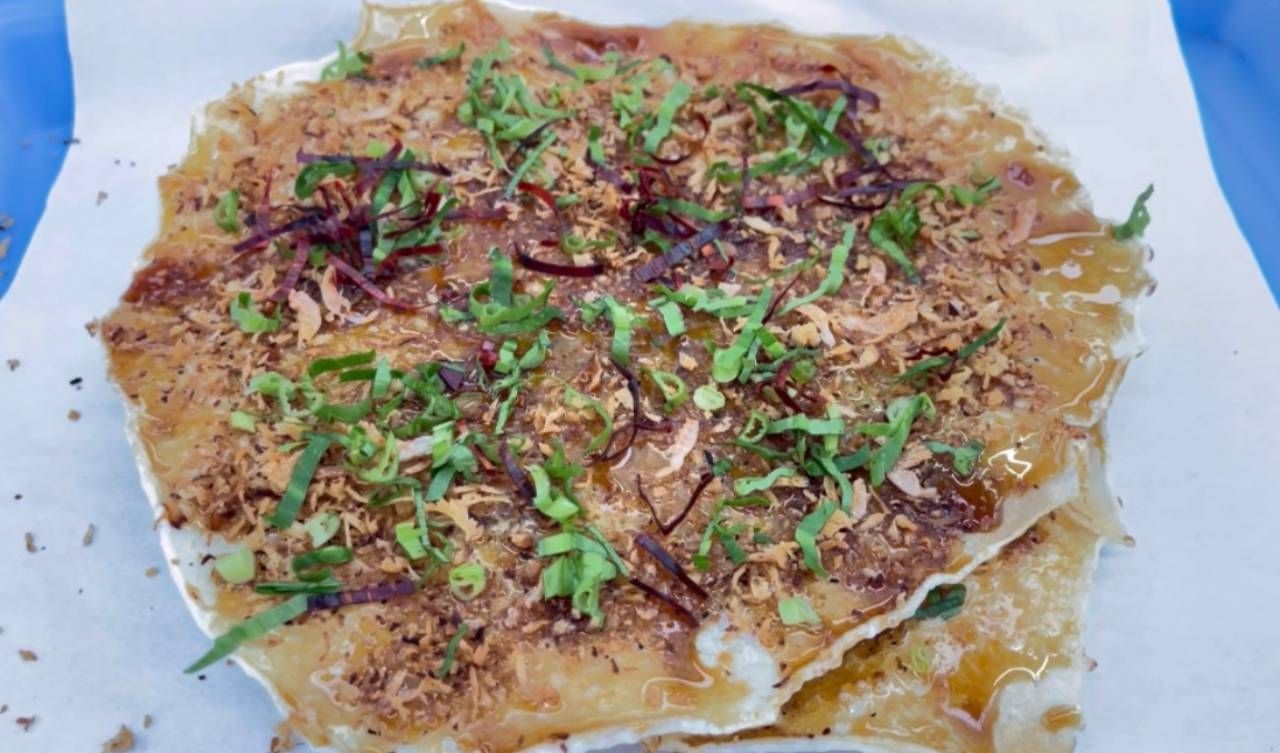 จากนั้นโรยด้วย มะพร้าวคั่ว กับกุ้งแห้ง เพื่อเพิ่มความกรอบความมัน เค็มนิดๆ จากกุ้งแห้ง ตามมาด้วย ผักชีฝรั่งหั่นฝอย พริกหยวกซอยสีแดง เพิ่มความหอม ความแซ่บ เรียกว่าหวานมันเค็ม กลิ่นหอมหวนชวนรับประทาน เป็นของทานเล่น ประเภทกรุบกรอบ ที่มีมาตั้งแต่โบราณ สืบทอดยาวนานกว่า 100 ปี เรียกว่าใครผ่านไปผ่านมาต้องแวะซื้อ กลับไปทานเล่นที่บ้าน