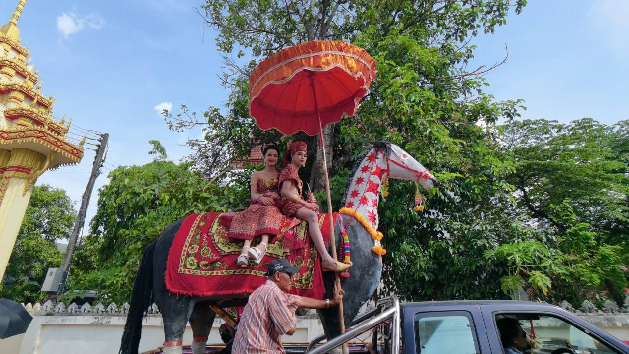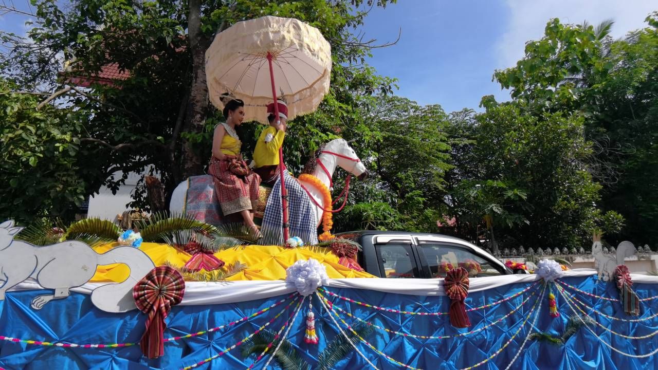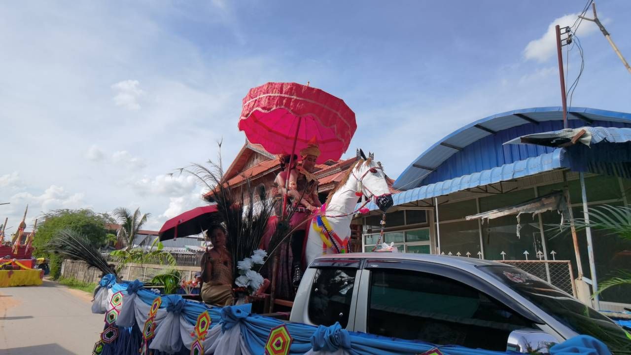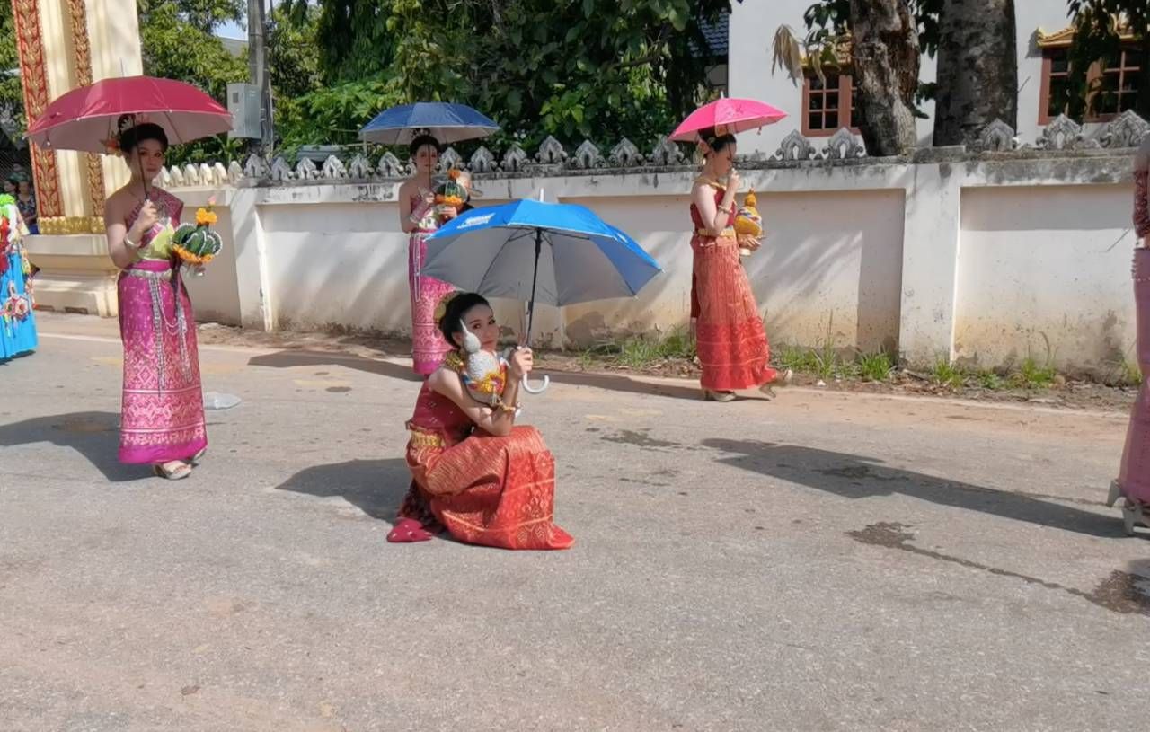โดยบรรยากาศวันแรกมีการประกวดขบวนแห่ มีนางรำจาก 11 หมู่บ้าน แต่งกายด้วยผ้าไทย-ผ้าพื้นเมืองฟ้อนรำอย่างสวยงาม ท่ามกลางสภาพอากาศที่ร้อนอบอ้าว นางรำก็ต้องอดทนรำเพราะลงทุนแต่งหน้าทำผมมาตั้งแต่รุ่งสางแล้ว ก็พบว่าขบวนนางรำ ขบวนแรก มีวิธีคลายร้อนให้นางรำ หนุ่ม-สาวถือป้าย ด้วยการแจกลูกอมเมนทอส ให้เย็นคลายร้อน ก็เลยเห็นเป็นภาพหนุ่มๆ สาวๆ กำลังใช้ปากกัดลูกอมอยู่ ซึ่งบางคนก็ใช้ความพยายามกัดอยู่นานจนเหนื่อย กว่าจะฉีกลูกอมออกมาอมได้ บางคนกัดซองลูกอมออกมาไม่ได้ ก็เลยถือลูกอมไว้คลายร้อนแทน.
