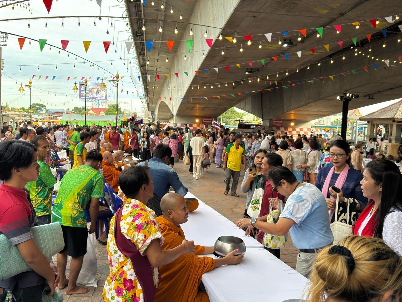 โดยมีประชาชนจำนวนมาก ให้ความสนใจทยอยเดินทางมาร่วมตักบาตรกันอย่างคึกคักตั้งแต่รุ่งเช้า โดยนำข้าวสาร อาหารแห้ง มารอตักบาตรพระสงฆ์จากวัดต่างๆ ที่ตั้งเรียงรายอยู่ริมน้ำเจ้าพระยา ในพื้นที่ของต.ปากเกร็ด ต.เกาะเกร็ด ต.บางตะไนย์ ต.บางพูด และ ต.คลองพระอุดม โดยพระสงฆ์จะนั่งเรือออกเดินทางจากวัดล่องมาตามแม่น้ำ เพื่อบิณฑบาตตามรายทางทั้งสองฝั่งแม่น้ำ ซึ่งระหว่างทางจะเทียบท่าน้ำ 6 แห่ง ให้ประชาชนร่วมทำบุญตักบาตรพระสงฆ์ทางเรือ ประกอบด้วย 1.ท่าเทียบเรือวัดบางจาก 2.ท่าเทียบเรือวัชรีวงศ์ 3.ท่าเทียบเรือวัดตำหนักเหนือ 4.ท่าเทียบเรือวัดเกาะพญาเจ่ง 5.ท่าเทียบเรือวัดปรมัยยิกาวาส วรวิหาร และ 6. ท่าเทียบเรือวัดสนามเหนือ