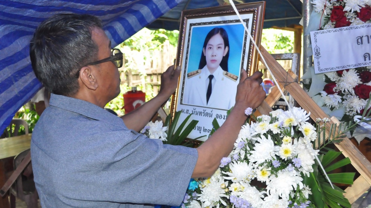 ความคืบหน้าล่าสุด เมื่อเวลา 11.30 น. วันที่ 11 ก.ค. ผู้สื่อข่าวลงพื้นที่บ้านเลขที่ 135 หมู่ 2 ต.แม่มอก อ.เถิน จ.ลำปาง ซึ่งเป็นสถานที่บำเพ็ญกุศลศพของ น.ส.นันทรัตน์ จองมล ครูสาวเคราะห์ร้าย พบว่าบรรยากาศภายในงานศพเป็นไปด้วยความโศกเศร้า มีเพื่อนบ้าน และเพื่อนของผู้ตายทยอยมาร่วมงานบำเพ็ญกุศลศพ และแสดงความเสียใจกับครอบครัวผู้ตาย อย่างต่อเนื่อง
