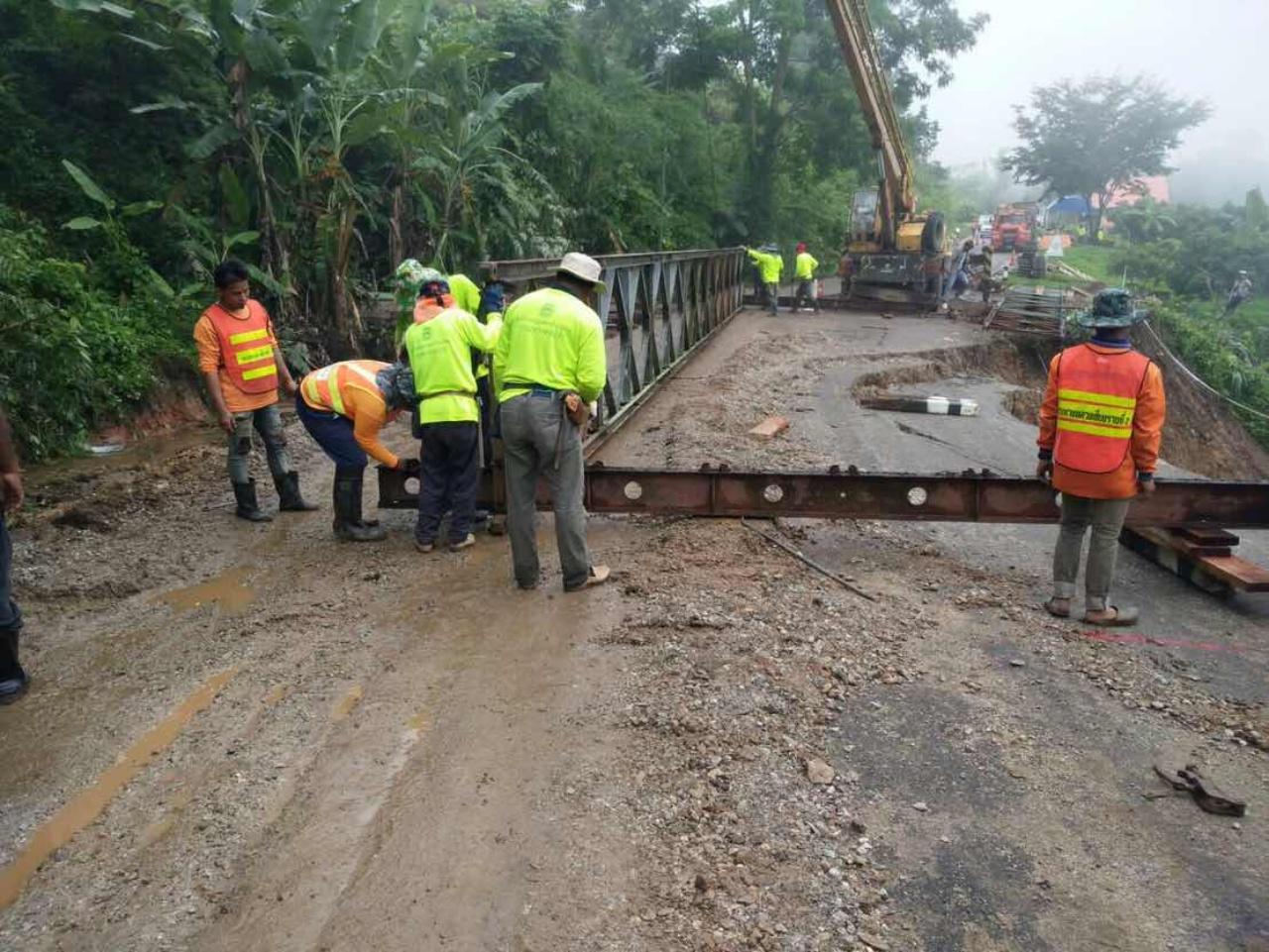 เช้าวันที่ 20 ก.ค. 60 นายนัทธพงศ์ ไชป้อ หัวหน้าหมวดทางหลวงเวียงแก่น เผยว่า ช่วงเช้าวันนี้ เจ้าหน้าที่แขวงทางหลวงเชียงรายที่ 2 หมวดทางหลวงเวียงแก่น หน่วยซ่อมบำรุงทางภูชี้ฟ้า จัดเจ้าหน้าที่มาทำงานร่วมกับ นายสัมพันธ์ เลิศแล้ว รอง ผอ.ศูนย์สร้างและบูรณะสะพานที่ 1 พิจิตร พร้อมเจ้าหน้าที่ผู้ชำนาญการติดตั้งสะพานเบลีย์ เพื่อติดตั้งบริเวณทางหลวงหมายเลข 1093 ช่วงขุนห้วยไคร้-ผาตั้ง บริเวณบ้านพิทักษ์ไทย ม.20 ต.ตับเต่า อ.เทิง จ.เชียงราย ซึ่งได้รับผลกระทบจากฝนตกหนักน้ำกัดเซาะถนนเกิดการทรุดตัวและดินสไลด์เสียหาย 1 ช่องจราจร พร้อมตั้งเต็นท์คอยอำนวยความสะดวก และมีเจ้าหน้าที่จากตำรวจ สภ.เทิง และทหารพรานกองร้อย ทพ.3102 ลงพื้นที่สนับสนุนการช่วยเหลือ ซึ่งทางเจ้าหน้าที่จะปิดถนนเส้นดังกล่าวเป็นการชั่วคราวเพื่อติดตั้งสะพานให้แล้วเสร็จ คาดว่าจะสามารถเปิดให้รถสัญจรได้ในช่วงเย็นวันที่ 21 ก.ค.นี้