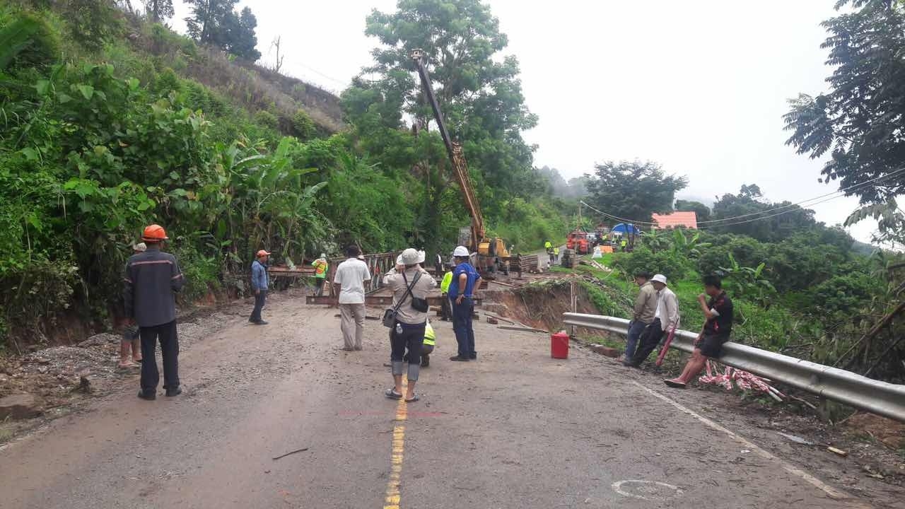 จนท.ทางหลวง นำกำลังรุดติดตั้งสะพานเบลีย์ หลังทางหลวงช่วงขุนห้วยไคร้-ผาตั้ง ต.ตับเต่า เจอฝนตกหนักถูกน้ำกัดเซาะทรุดเสียหาย คาด เปิดให้สัญจรได้เย็นพรุ่งนี้ เร่งดำเนินการอีก 2 จุด ใน อ.เวียงแก่น