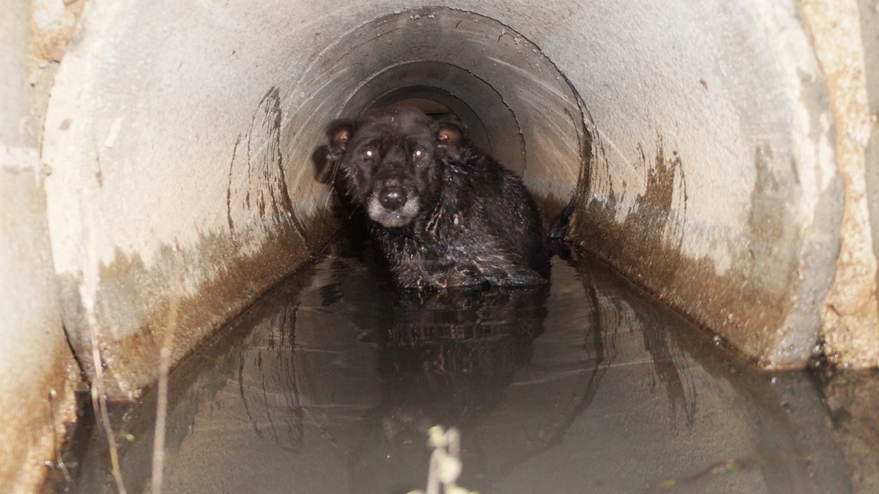 เมื่อมุดลงไปดูก็พบ สุนัขพันธุ์ไทยสีดำ เพศผู้ อายุประมาณ 2 ปี อยู่ในอาการตื่นกลัวลำตัวเปียกชุ่มไปด้วยน้ำเสีย ยืนส่งเสียงร้องอยู่ แต่เมื่อเจ้าหน้าที่จะเข้าไปใกล้ สุนัขก็เดินหนีลึกเข้าไปอีก นายสินธุ์ชัย เอี่ยมสว่าง เจ้าหน้าที่กู้ภัยอีกคน จึงต้องมุดเข้าไปในท่อระบายน้ำอีกฝั่งแล้วค่อยๆ คลานไล่สุนัขตัวดังกล่าวออกมาจึงสามารถช่วยนำขึ้นมาได้อย่างทุลักทุเล
