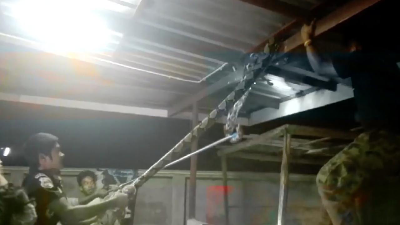 อาสาสมัครกู้ภัยข่าวภาพสุโขทัย ช่วยจับงูเหลือมยาว 3 เมตร 80 เซนติเมตร เลื้อยพันคานหลังคาห้องครัวชาวบ้าน ปล่อยคืนธรรมชาติ