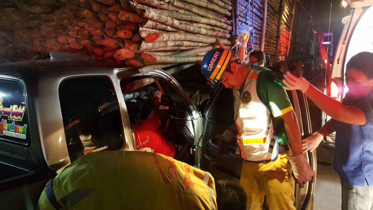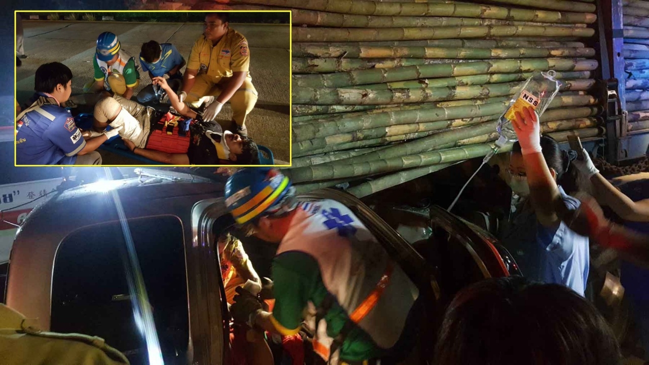 สองหนุ่มกู้ภัยหวิดดับ ขับปิกอัพชนท้ายรถบรรทุกไม้เสียบทะลุกระจก ถูกลากติดไปด้วยเกือบ 100 เมตร เพื่อนๆ กู้ภัยต้องใช้เครื่องตัดถ่างช่วยชีวิตนานเกือบชั่วโมง ยังมีโชคดีอยู่บ้าง ที่ปลายแหลมของไม้ไผ่ ไม่เสียบคอคนขับ...