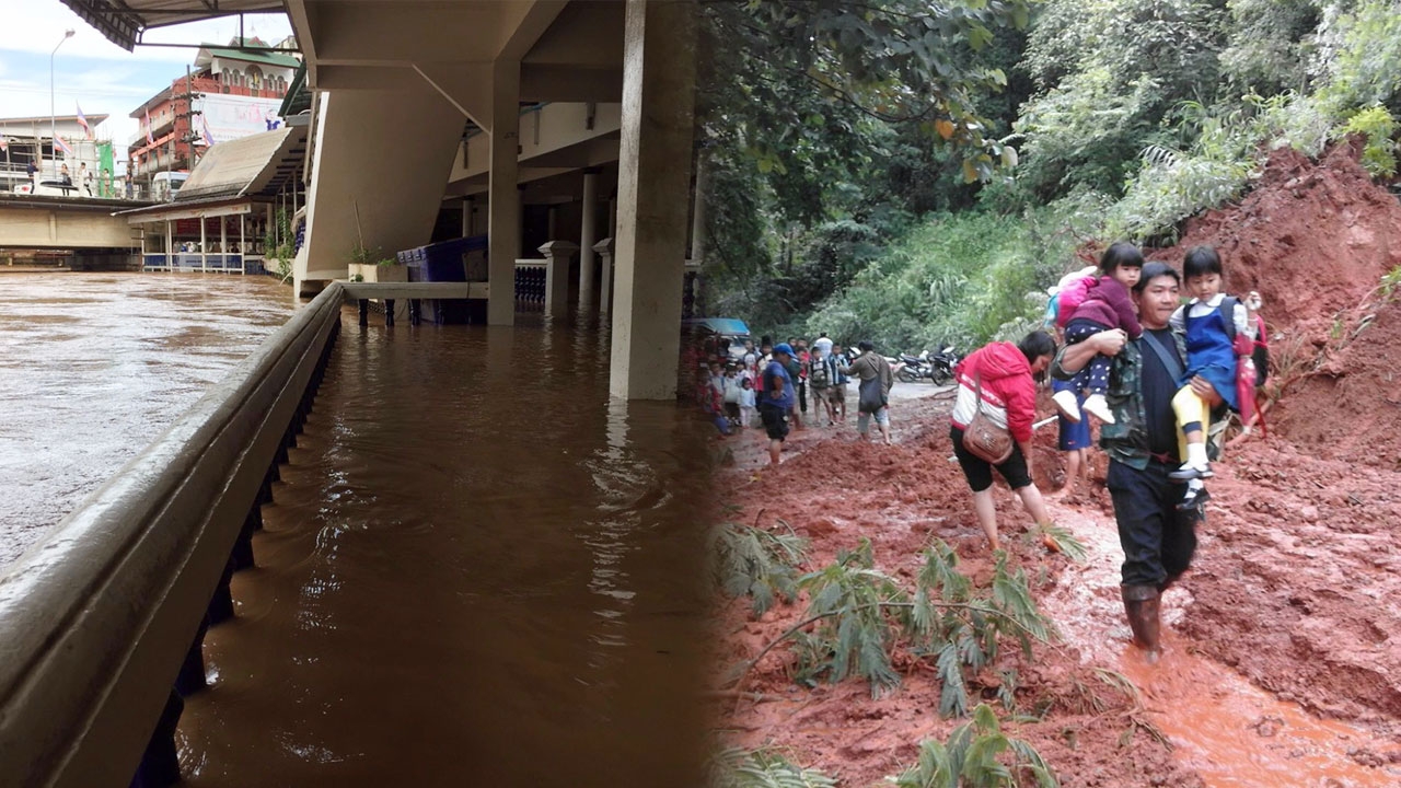 ที่เชียงราย ฝนตกต่อเนื่องตลอดทั้งวัน ประกอบกับมีฝนตกหนัก ที่ต้นน้ำฝั่งพม่า ส่งผลให้แม่น้ำเพิ่มระดับ เอ่อท่วมถนน-ส่วนที่ อ.แม่ฟ้าหลวง ดินสไลด์ปิดถนนทางขึ้นพระธาตุดอยตุงสายใหม่ รถสัญจรไม่ได้ ...