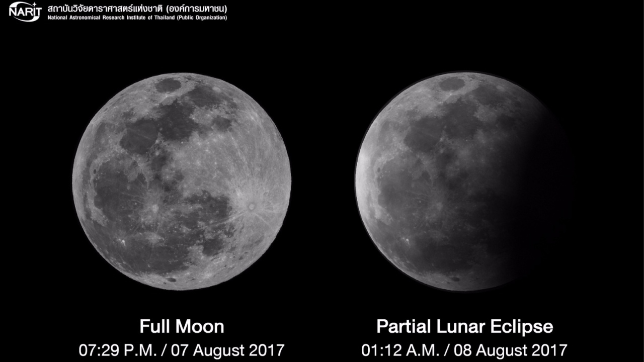 สถาบันวิจัยดาราศาสตร์แห่งชาติ (องค์การมหาชน) (สดร.) กระทรวงวิทยาศาสตร์และเทคโนโลยี เผยภาพปรากฏการณ์จันทรุปราคาบางส่วน เช้ามืดวันนี้ (8 สิงหาคม 2560) บันทึกภาพโดยกล้องโทรทรรศน์ขนาดเส้นผ่านศูนย์กลาง 0.7 เมตร ณ หอดูดาวเฉลิมพระเกียรติ 7 รอบ พระชนมพรรษา ฉะเชิงเทรา เมื่อเวลาประมาณ 01.12 น. (ตามเวลาประเทศไทย) สังเกตเห็นได้ชัดเจนว่าดวงจันทร์เต็มดวงมีลักษณะเว้าแหว่ง รวมถึงความสว่างของดวงจันทร์ลดลงเล็กน้อย แม้จะเป็นช่วงหน้าฝนแต่หลายจังหวัดของไทยสามารถสังเกตได้ในหลายพื้นที่
